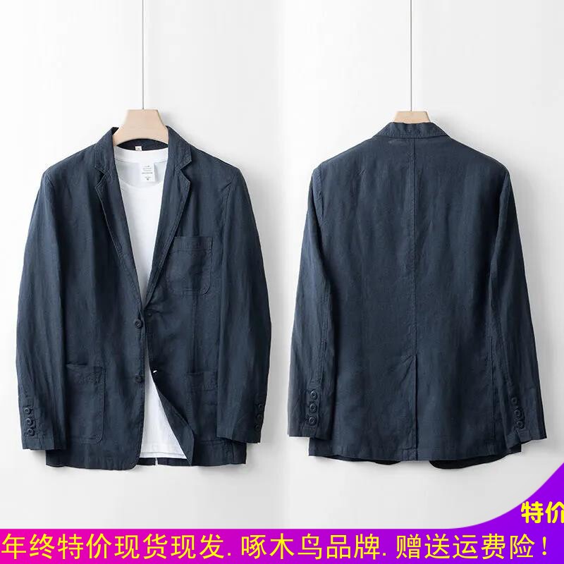 啄木鸟西服男士外套宽松亚麻休闲中青年薄款棉麻春秋季透气小西装