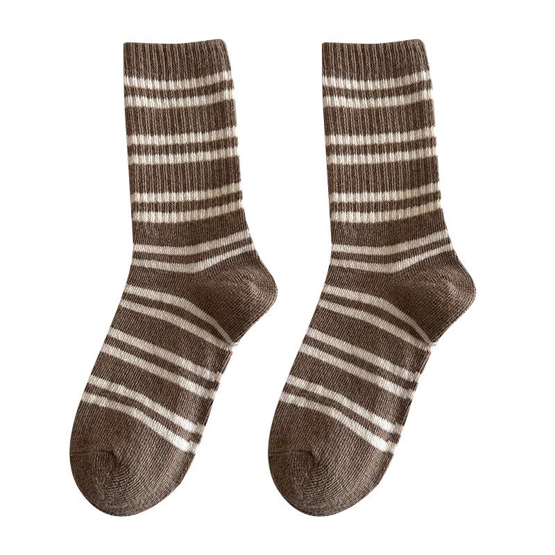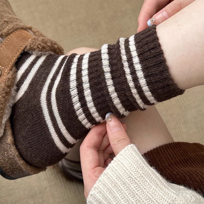 保暖羊毛条纹袜子女中筒袜秋冬季加厚加绒韩国日系运动冬天长筒袜
