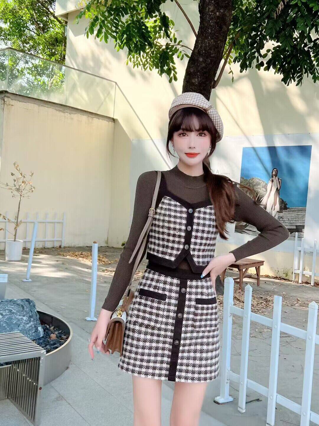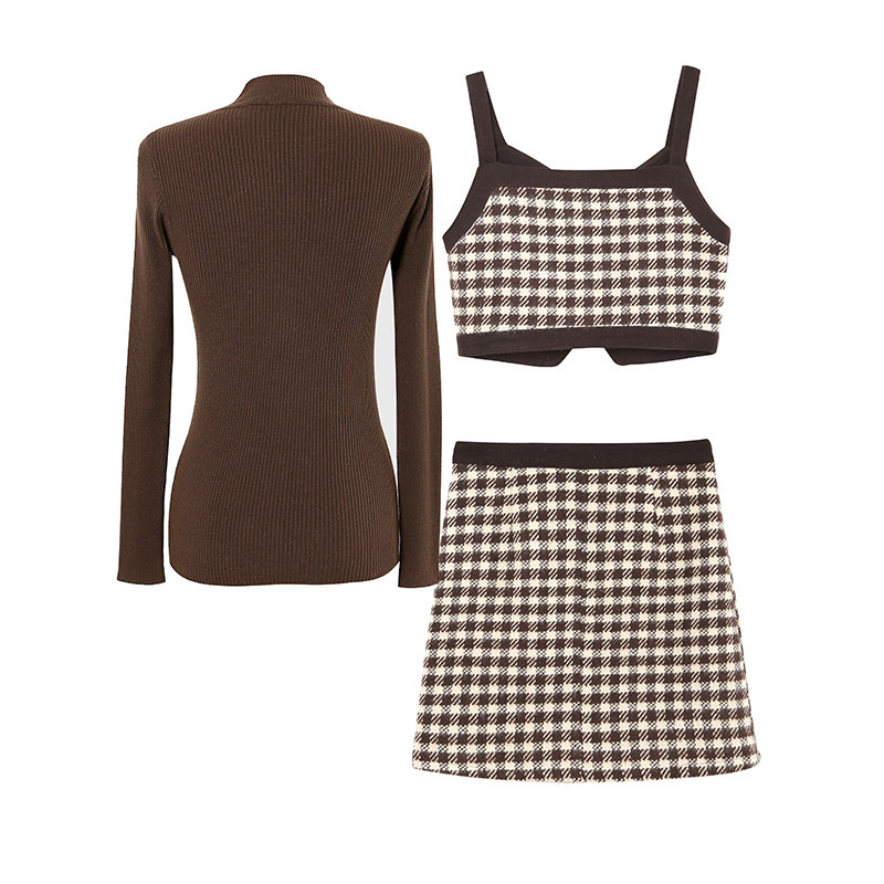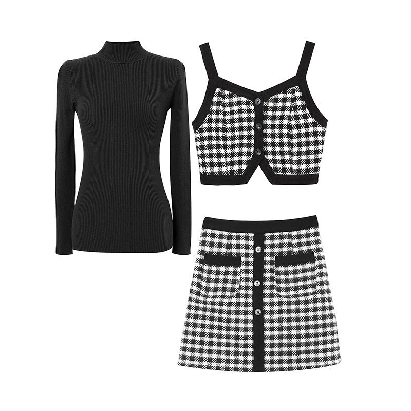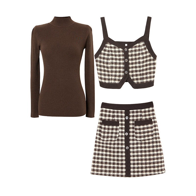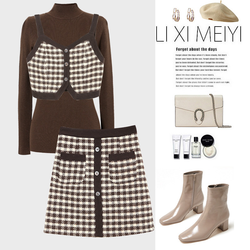 梨兮冬新款修身针织打底衫千鸟格毛呢背心高腰短裙三件套裙子套装