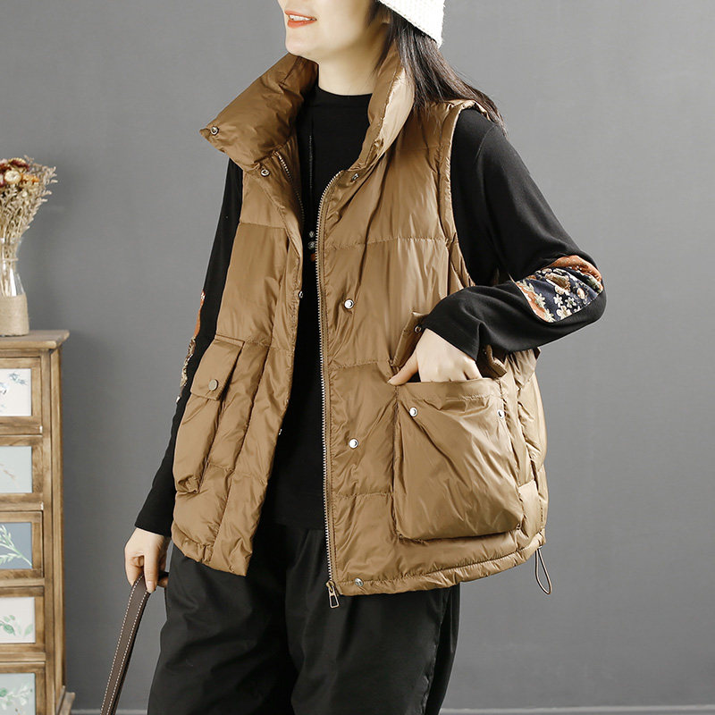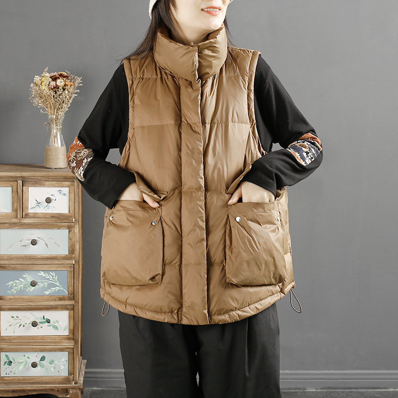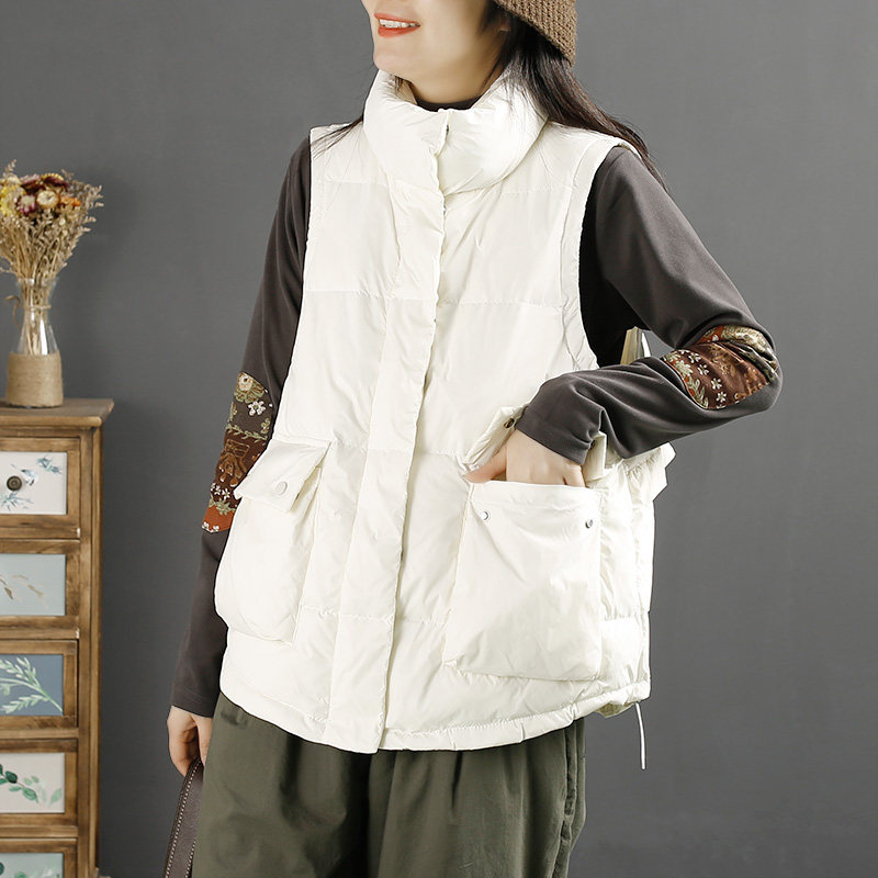 千秋飞燕文艺简约纯色木耳边立领羽绒马甲冬季新款白鸭绒无袖外套