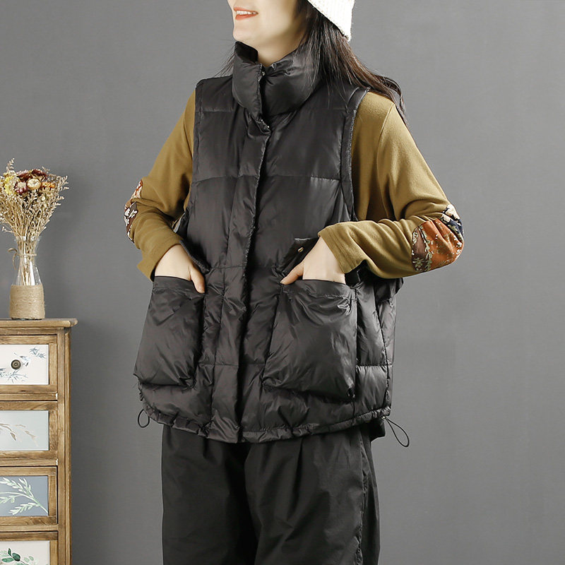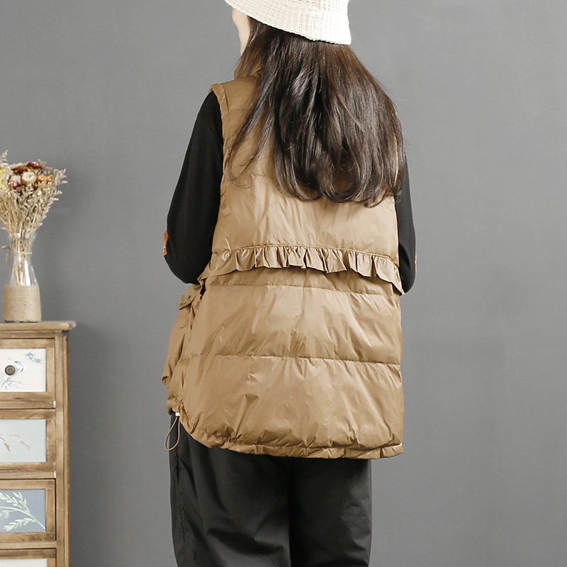 千秋飞燕文艺简约纯色木耳边立领羽绒马甲冬…