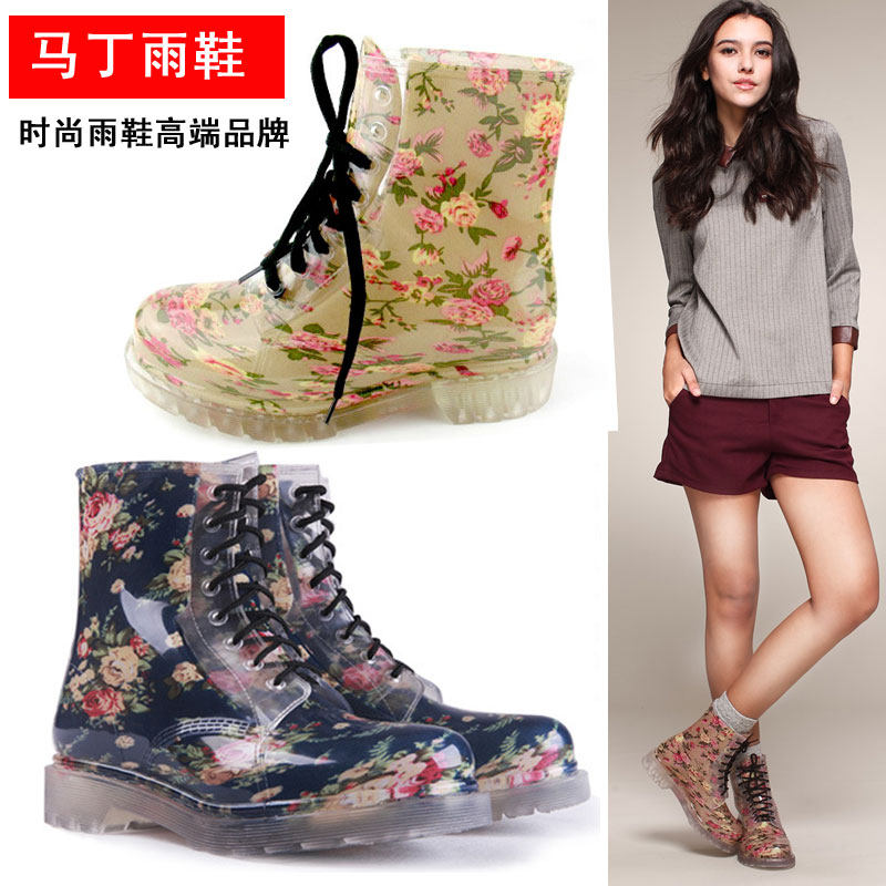 2017新款 时尚马丁雨鞋 女士碎花雨靴透明印花水鞋 风靡欧美 包邮