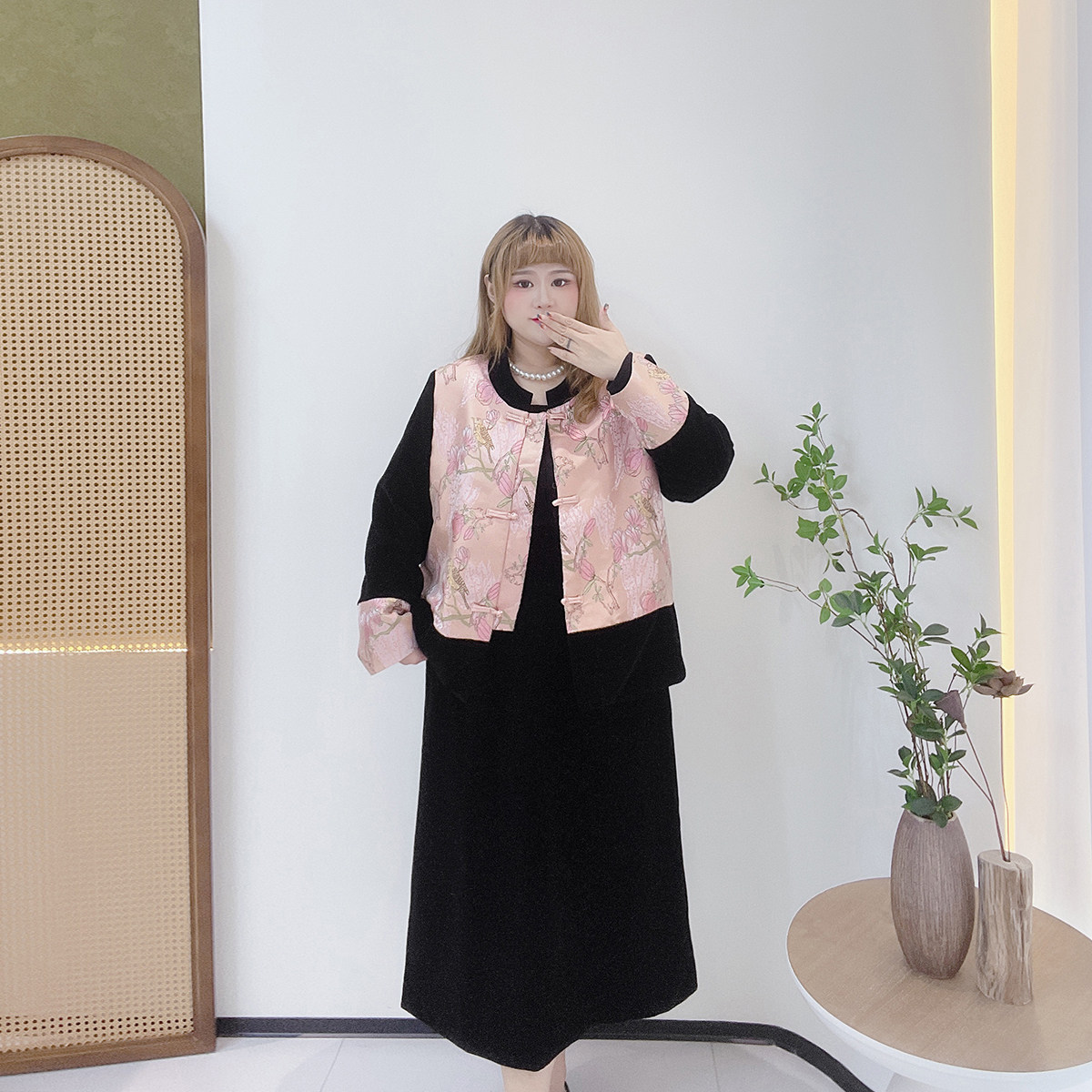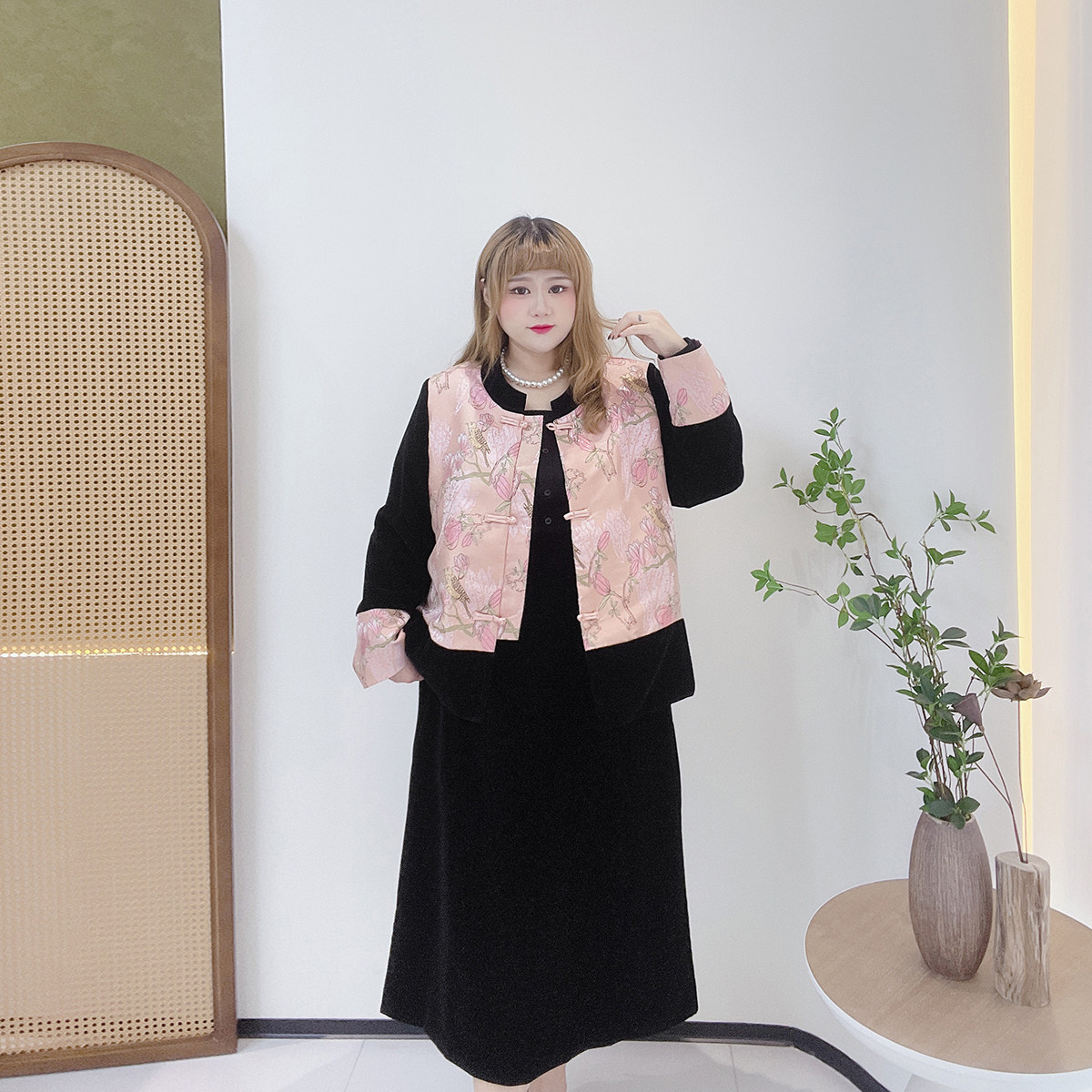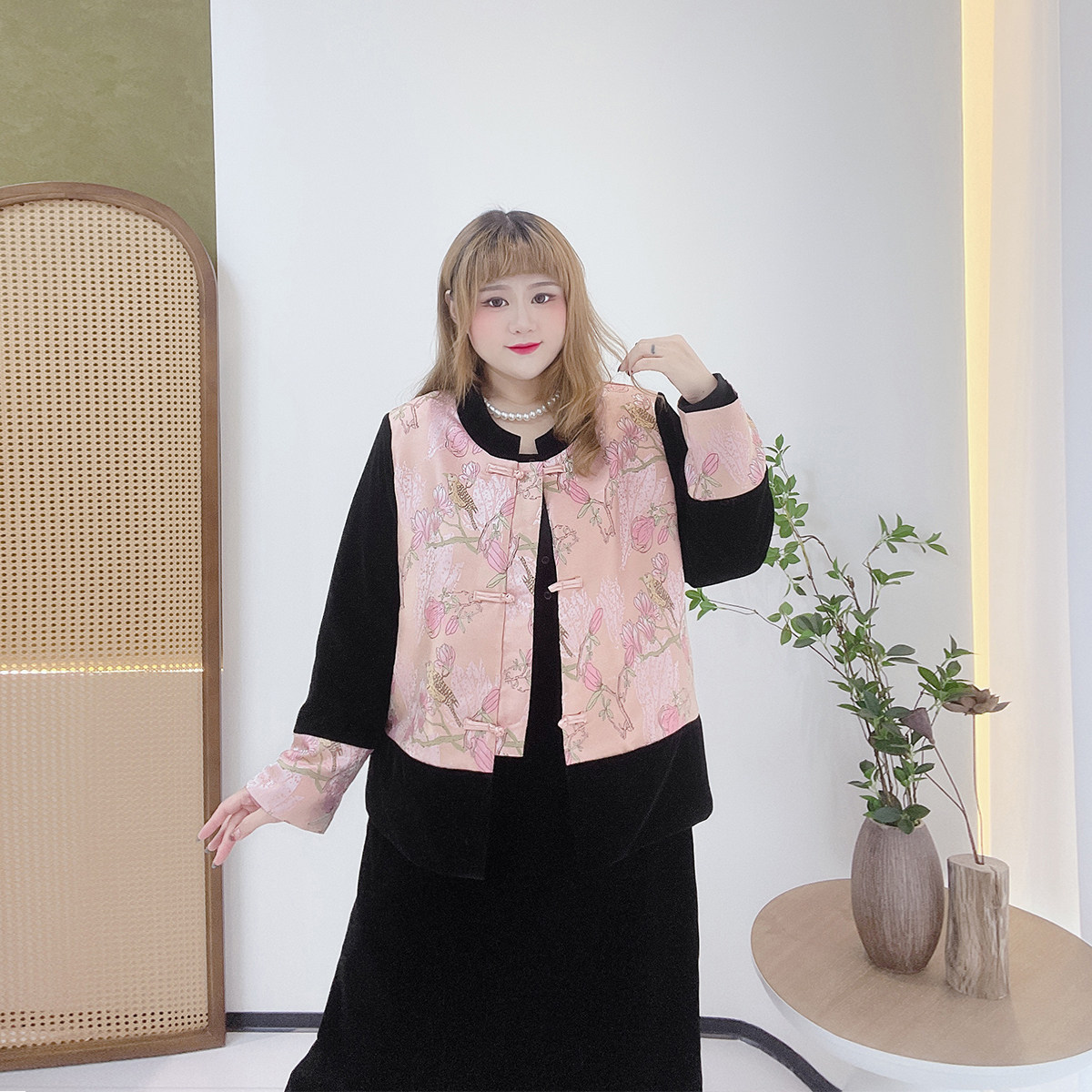 300斤新中式套装胖莹莹大码女装胖mm国风提花夹棉外套丝绒半身裙