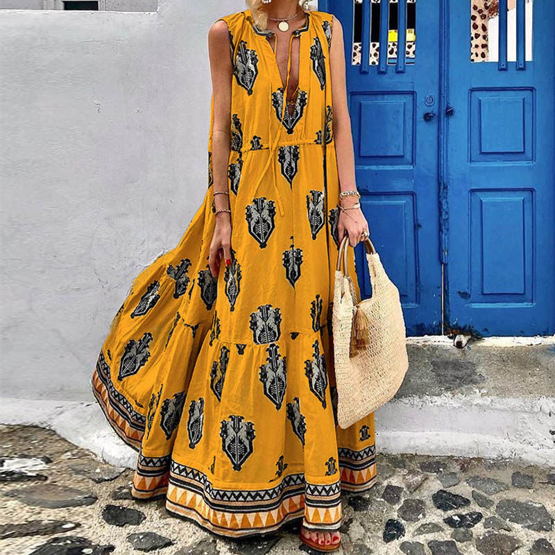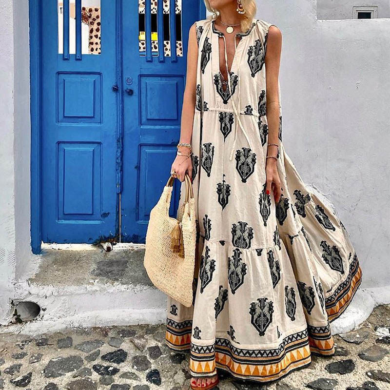 2023春夏新款泰国巴厘岛旅游显瘦无袖连衣长裙女海边度假沙滩裙子