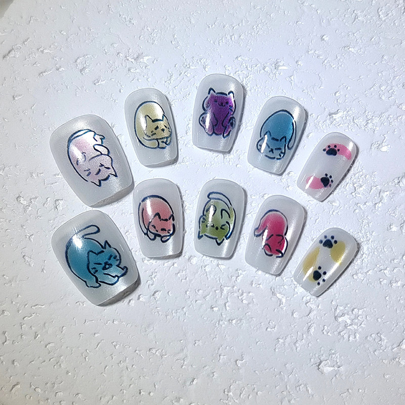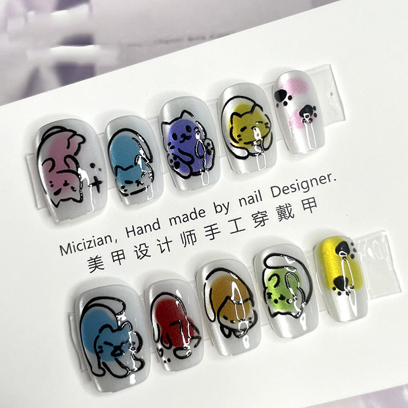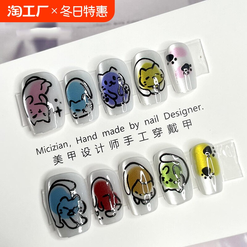 纯手工穿戴甲手绘猫咪裸色猫眼可爱学生党指甲贴片可拆卸