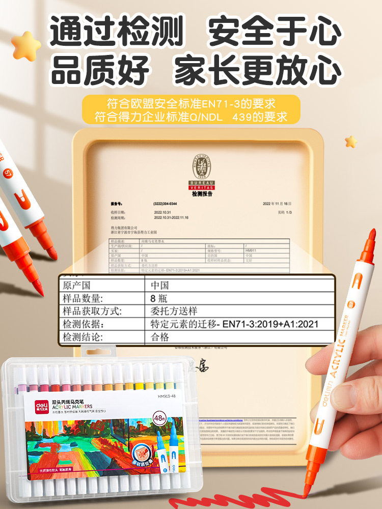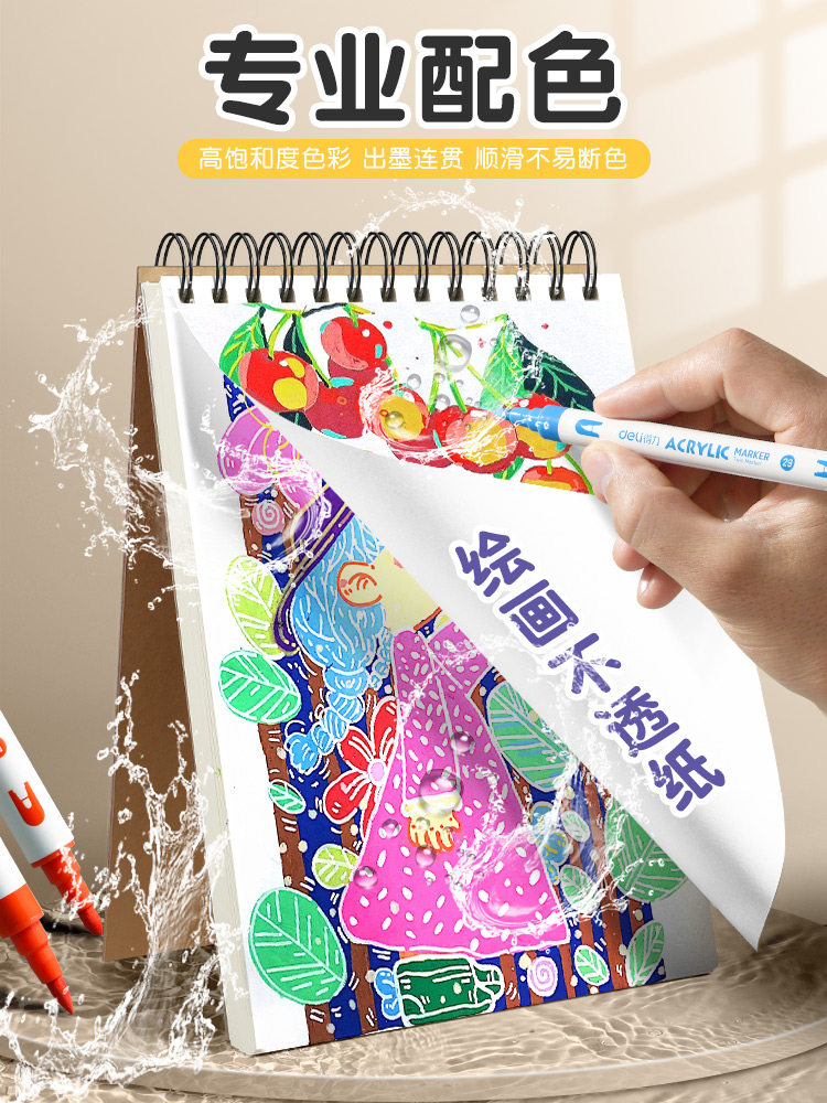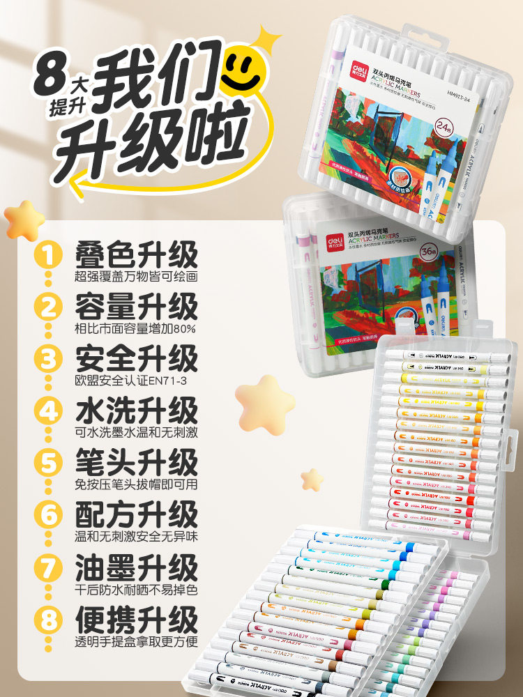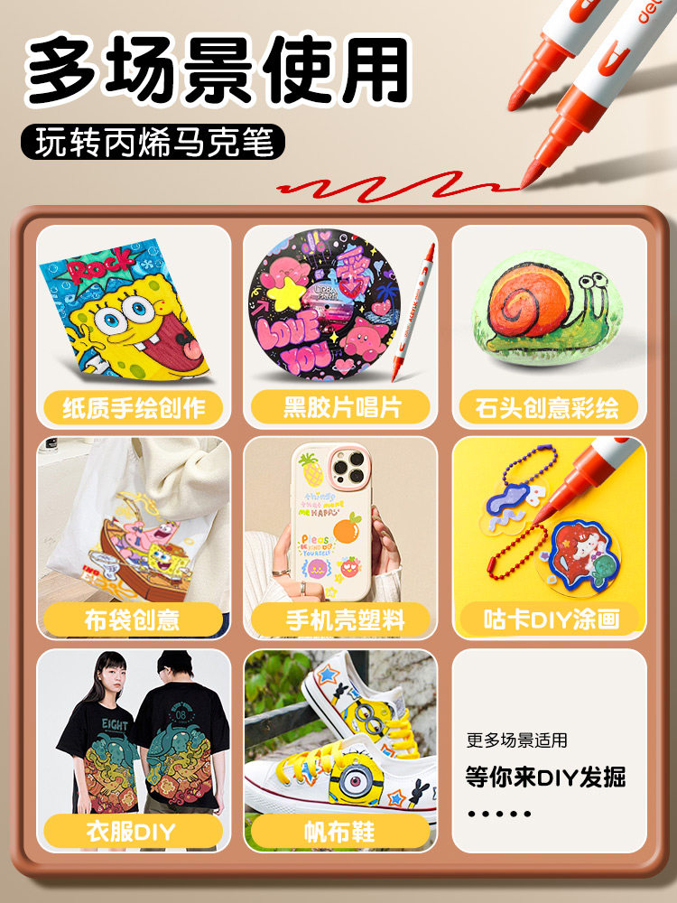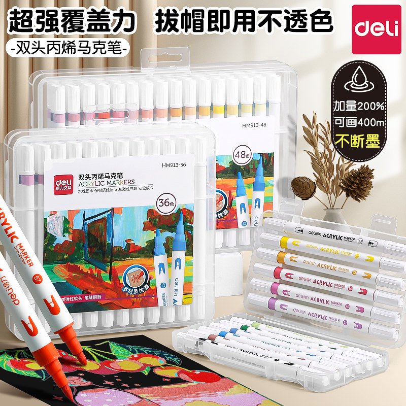 得力双头丙烯马克笔学生儿童美术专用软头防水手绘DIY不透可叠色画笔炳烯无毒可水洗24色36速干48水彩笔笔芯