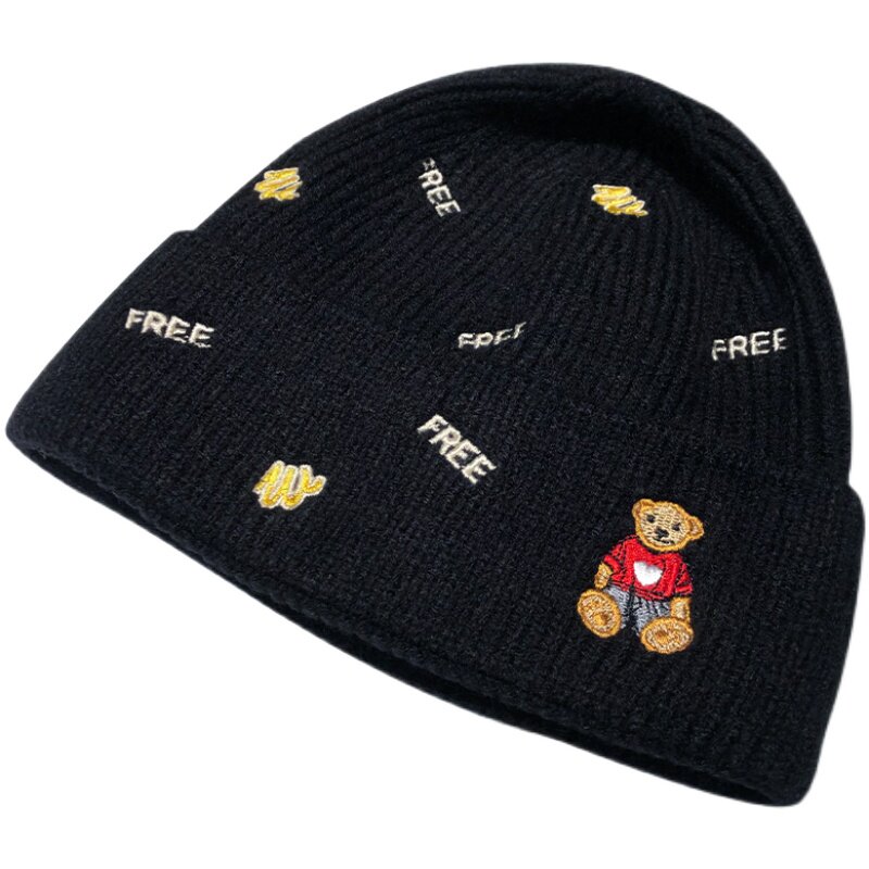 韩版潮白色针织帽子女冬季百搭小熊刺绣可爱毛线帽潮流保暖冷帽女