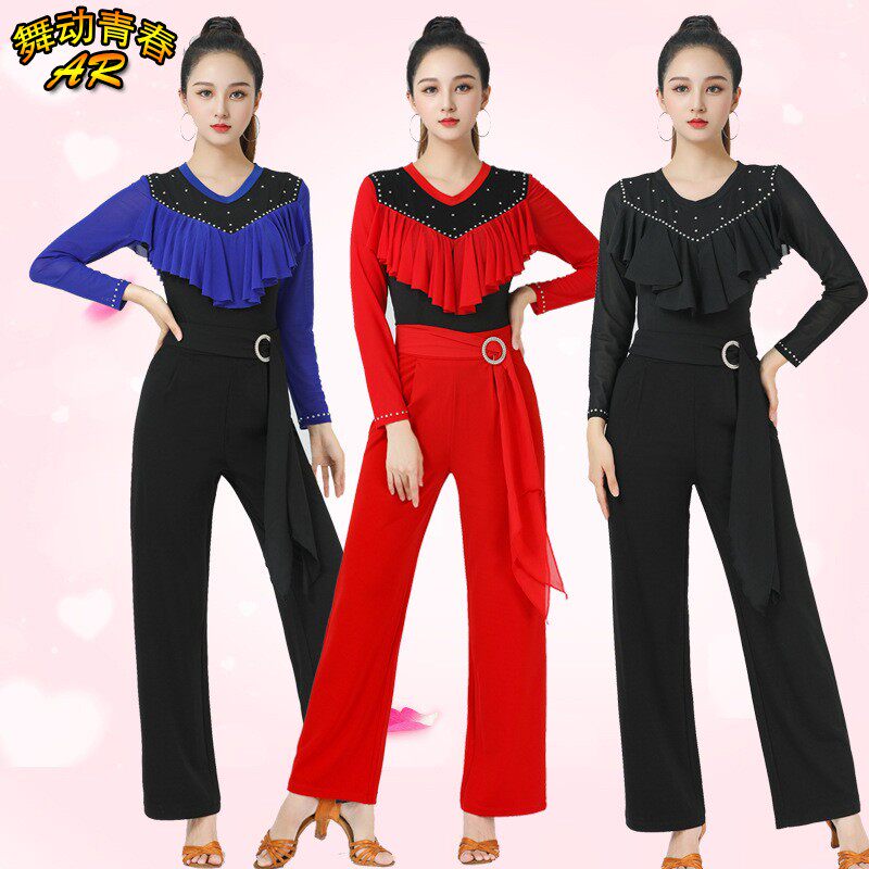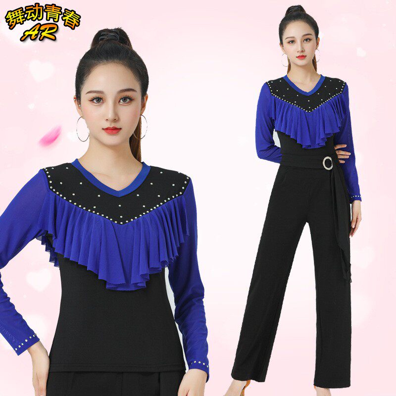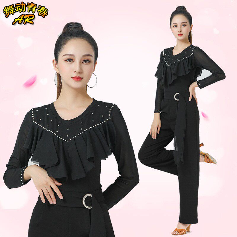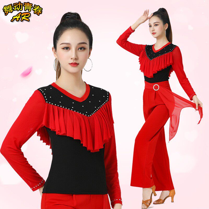 淘宝AR舞动青春,吉特巴舞蹈上衣新款长袖广场舞服装女三步踩时尚荷叶边镶钻舞蹈服