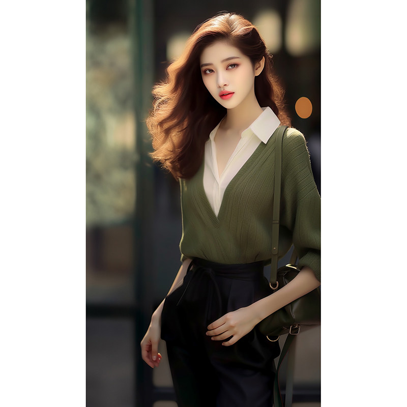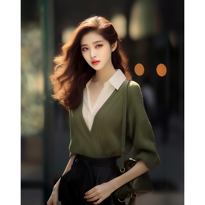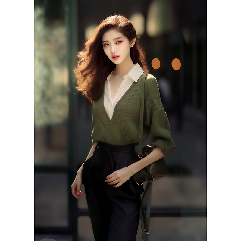 早秋小香风高级感超好看绿色针织上衣职业装假两件衬衫拼接毛衣女