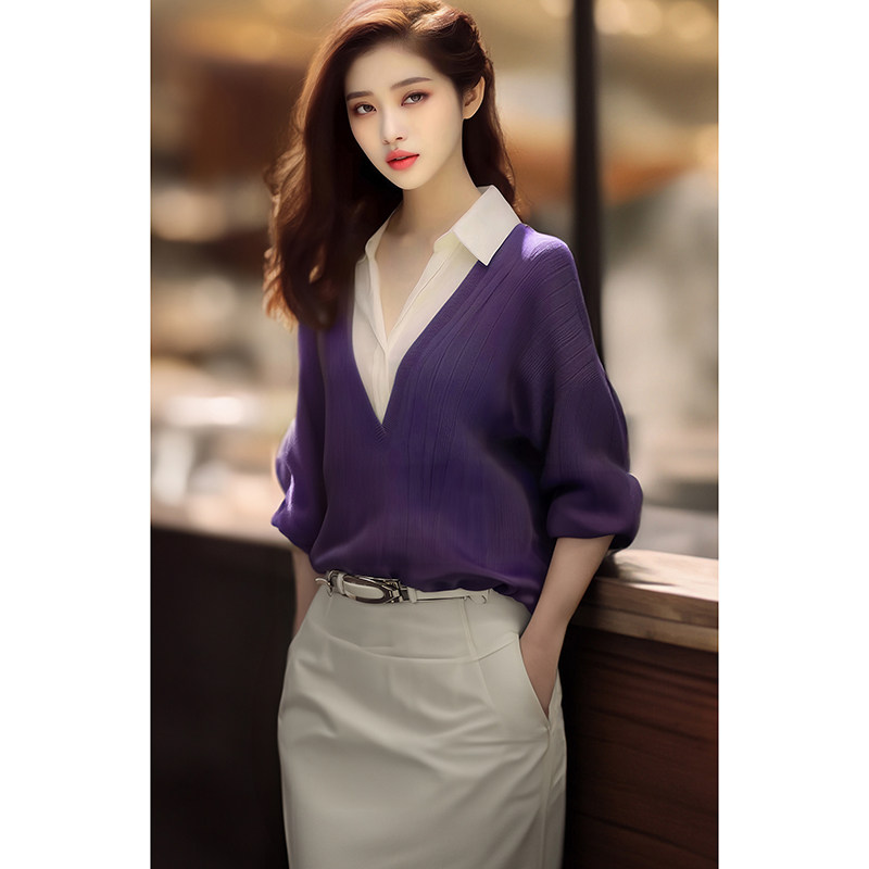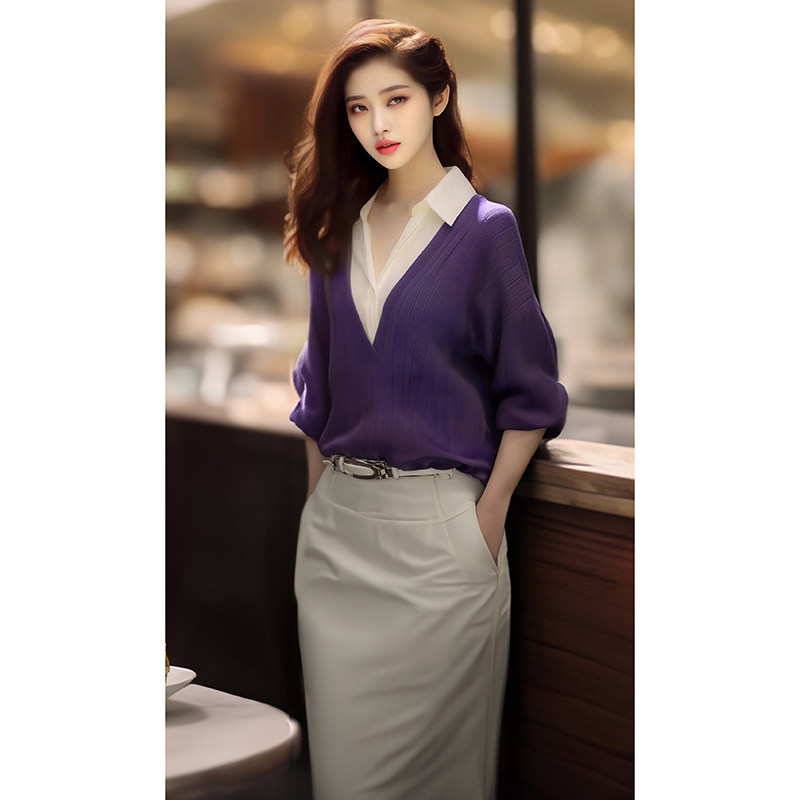 天猫梦纤云旗舰店,早秋小香风高级感超好看绿色针织上衣职业装假两件衬衫拼接毛衣女