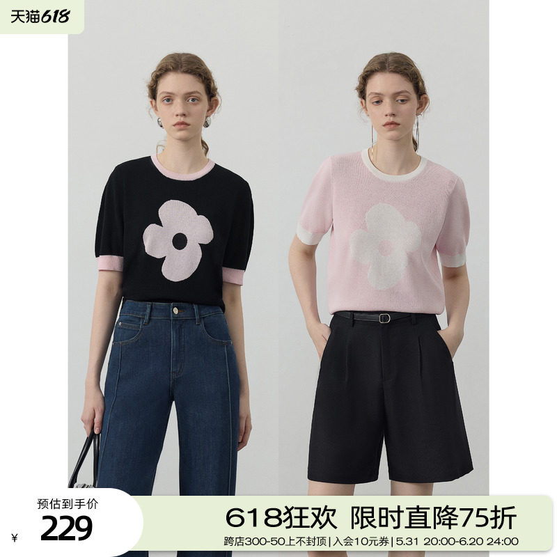 博主同款 CIRCLOFY瑟夕撞色花朵简约时尚T恤宽松圆领针织短袖