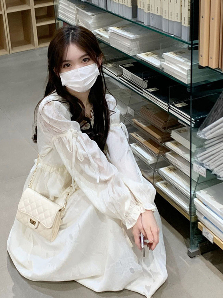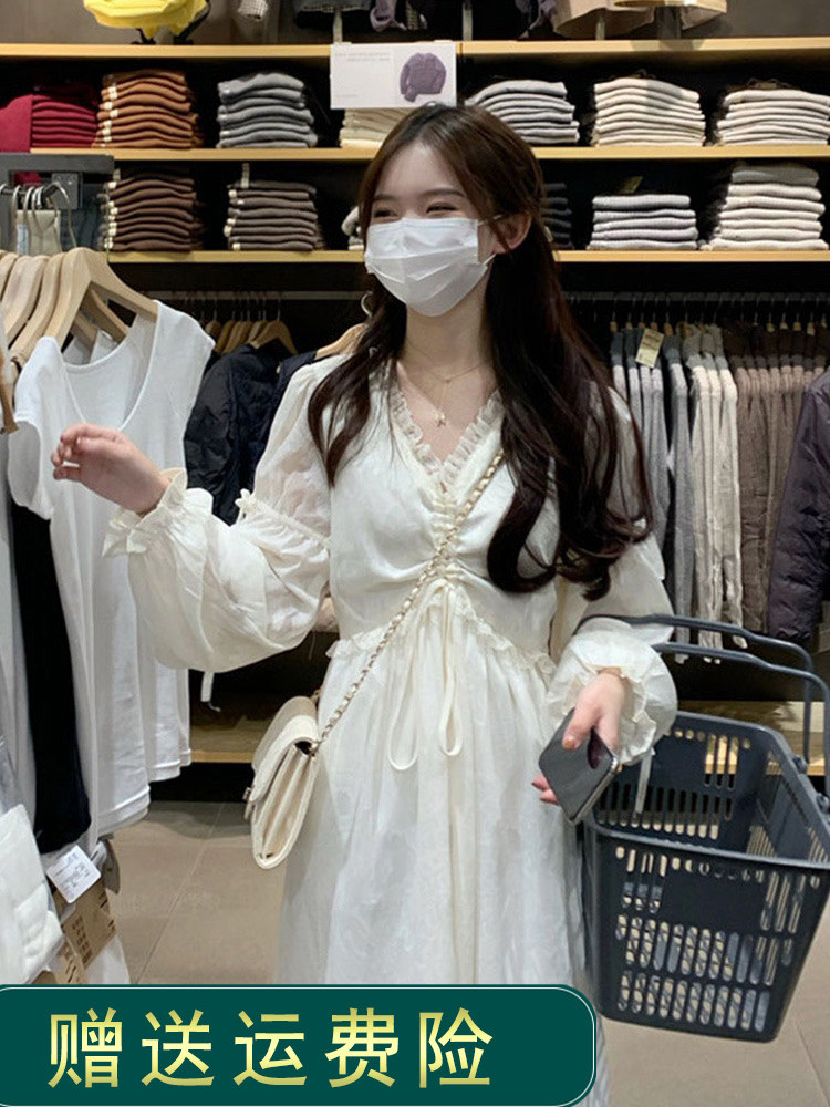 淘宝无奈的女装,茶歇法式白色v领抽绳褶皱长袖连衣裙女春秋宫廷风收腰仙女长裙子