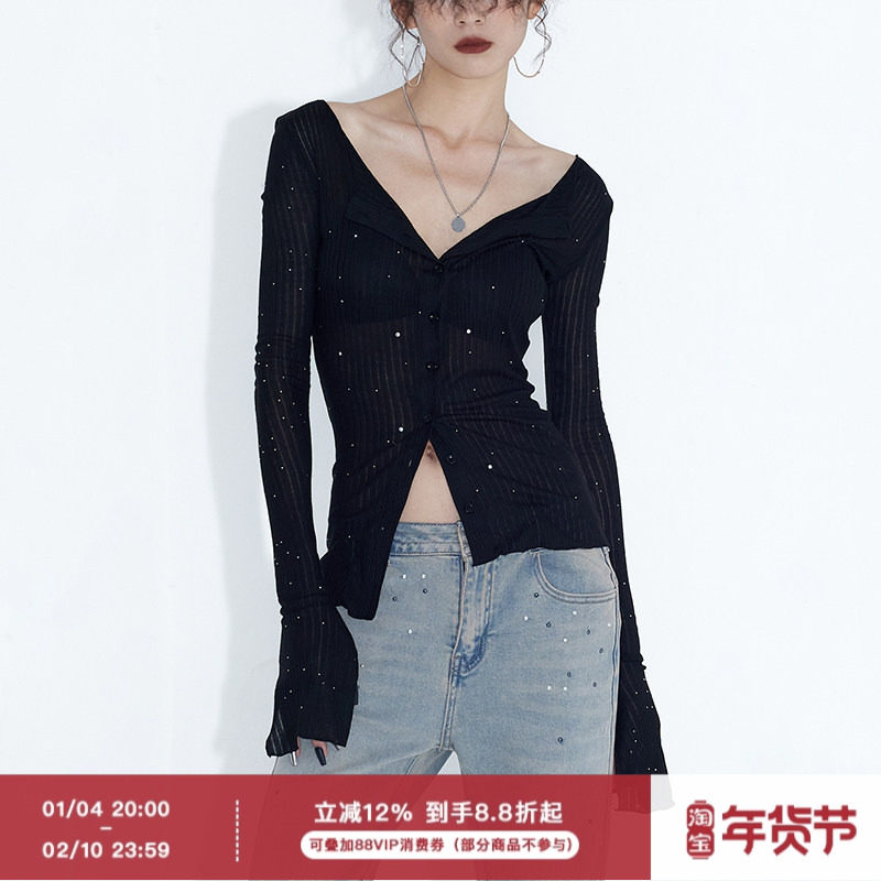 淘宝ourhour,ourhour黑色开衩烫钻银闪开衫