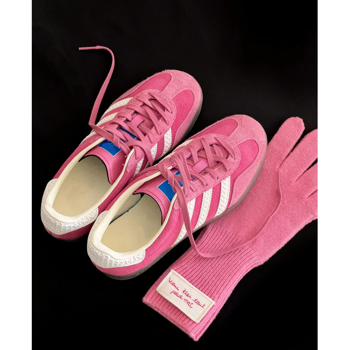 草莓熊~真皮粉色德训鞋女2024春秋运动鞋三杠小白鞋板鞋阿甘鞋子