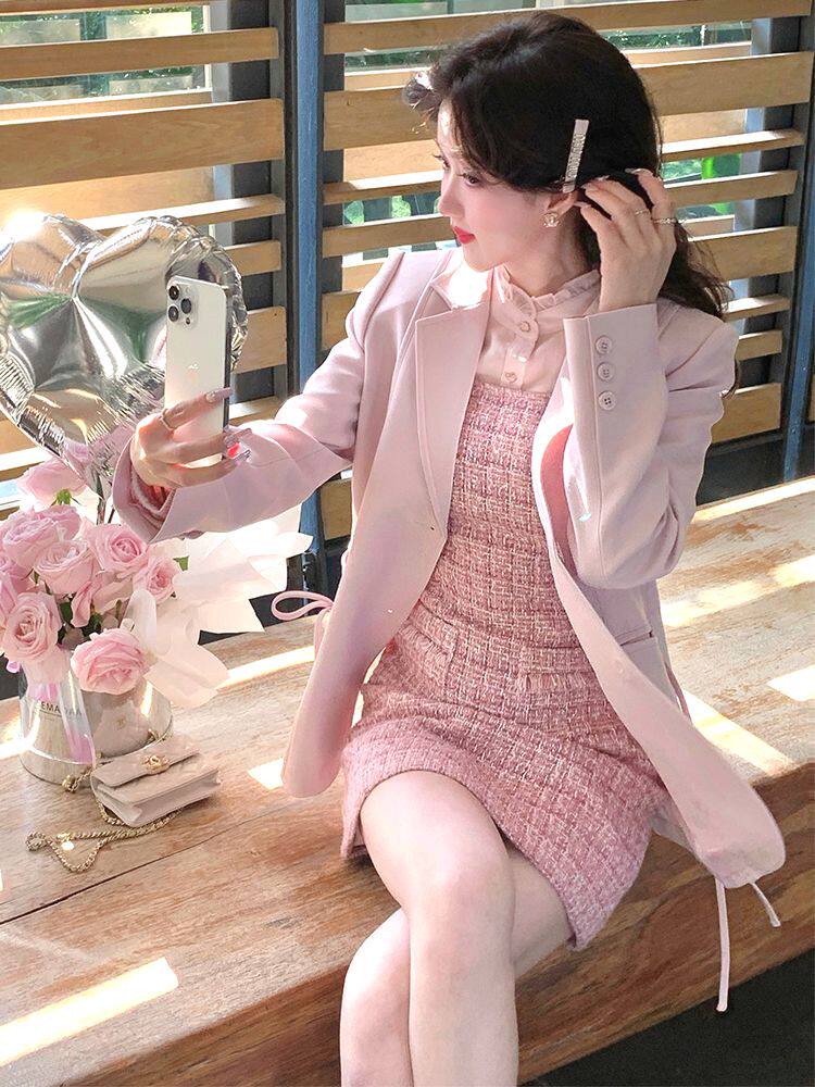 草莓雪顶/富家千金粉色肌理小香背心裙+长袖上衣两件套装2024新款