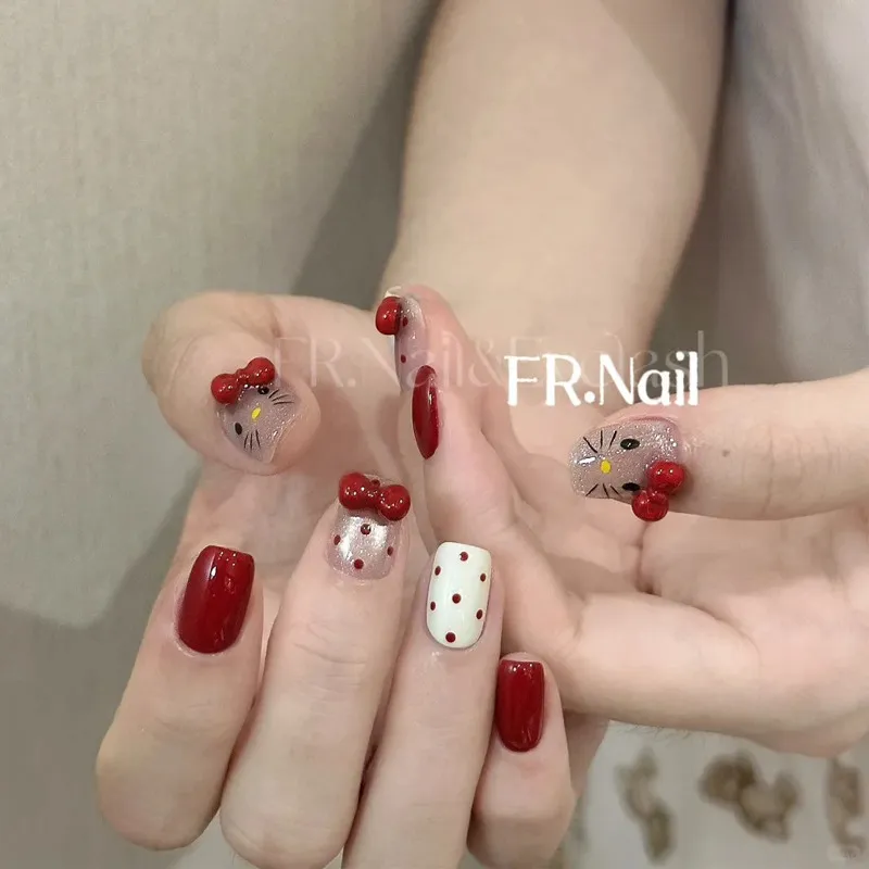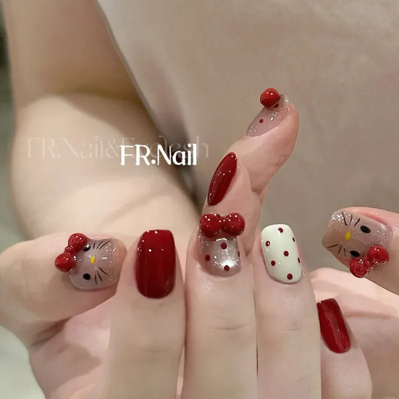 手工制作成品美甲贴片红色波点显白可爱Kitty穿戴甲 可卸贴片