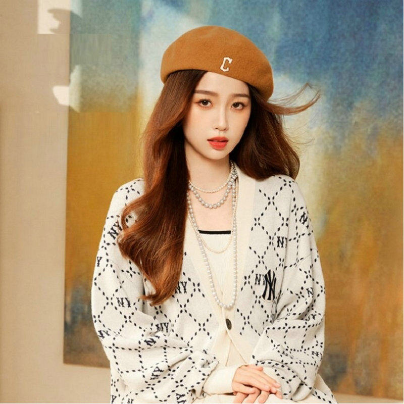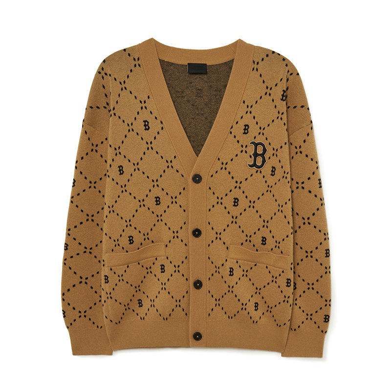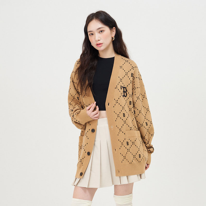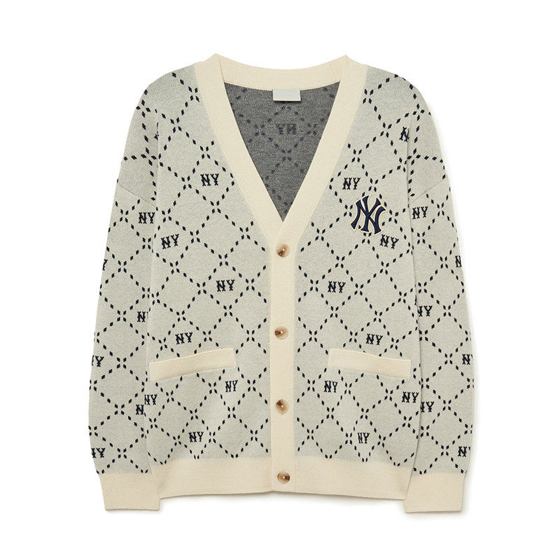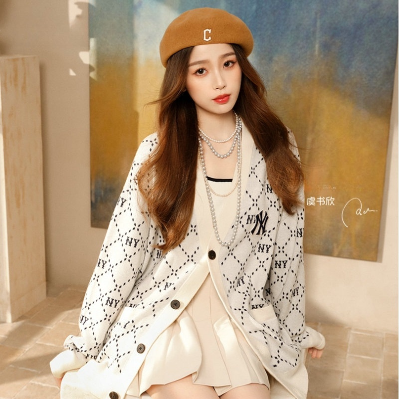 韩版潮牌经典NY开衫女情侣满印老花拼色v领针织毛衣毛衫宽松外套