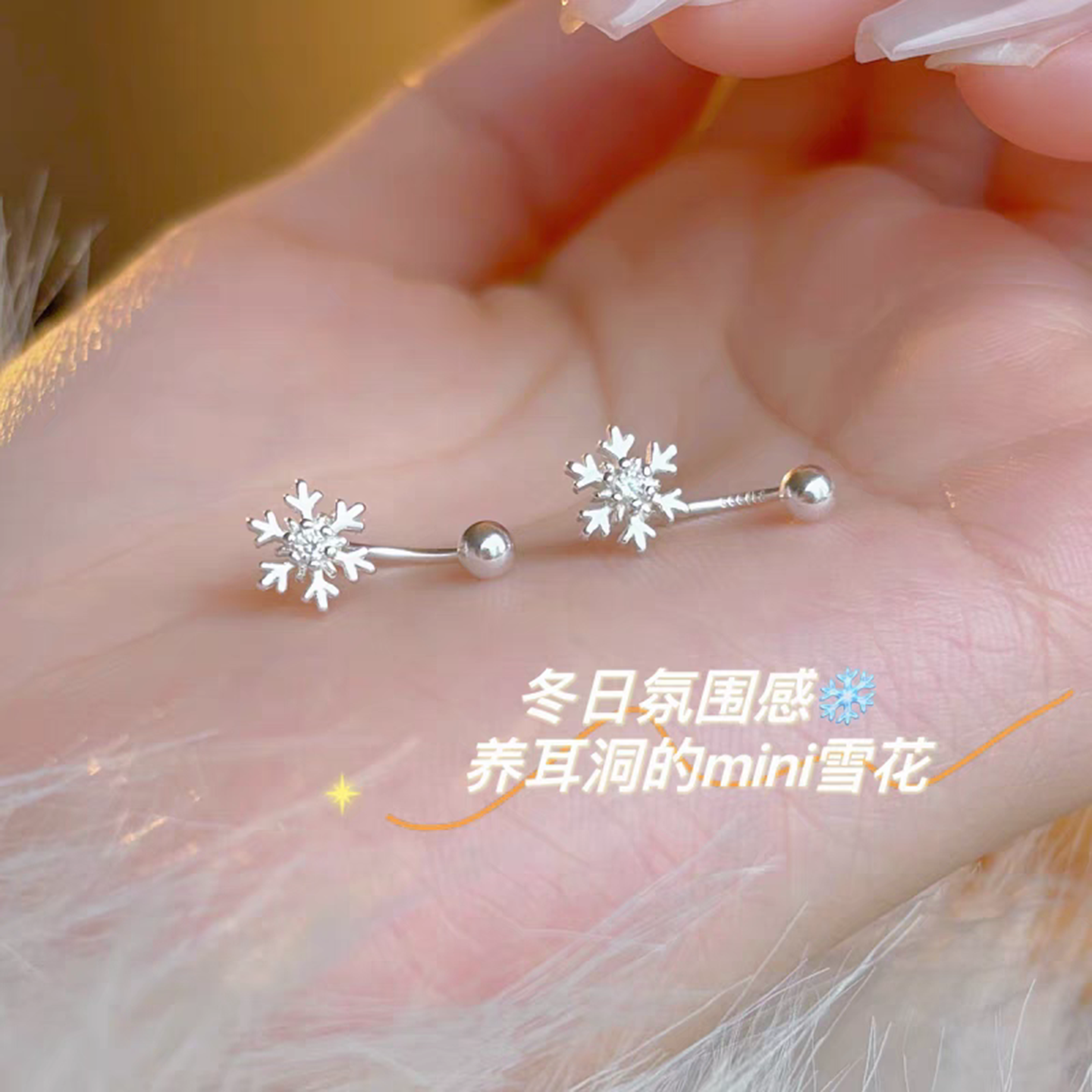 淘宝ANJALA饰品,s925银雪花螺丝拧扣耳钉女小众设计感气质U形后挂式耳环两戴耳饰