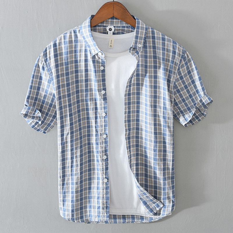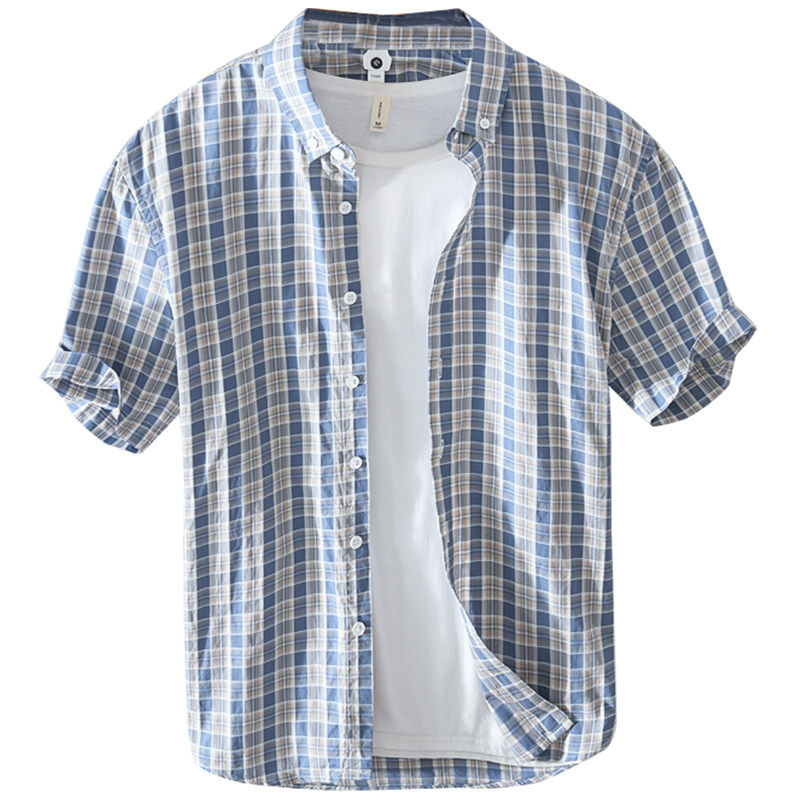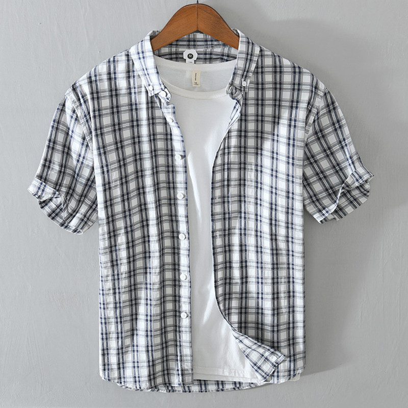 淘宝GOOD品质男装,日系格子男短袖纯棉夏季休闲男衬衫