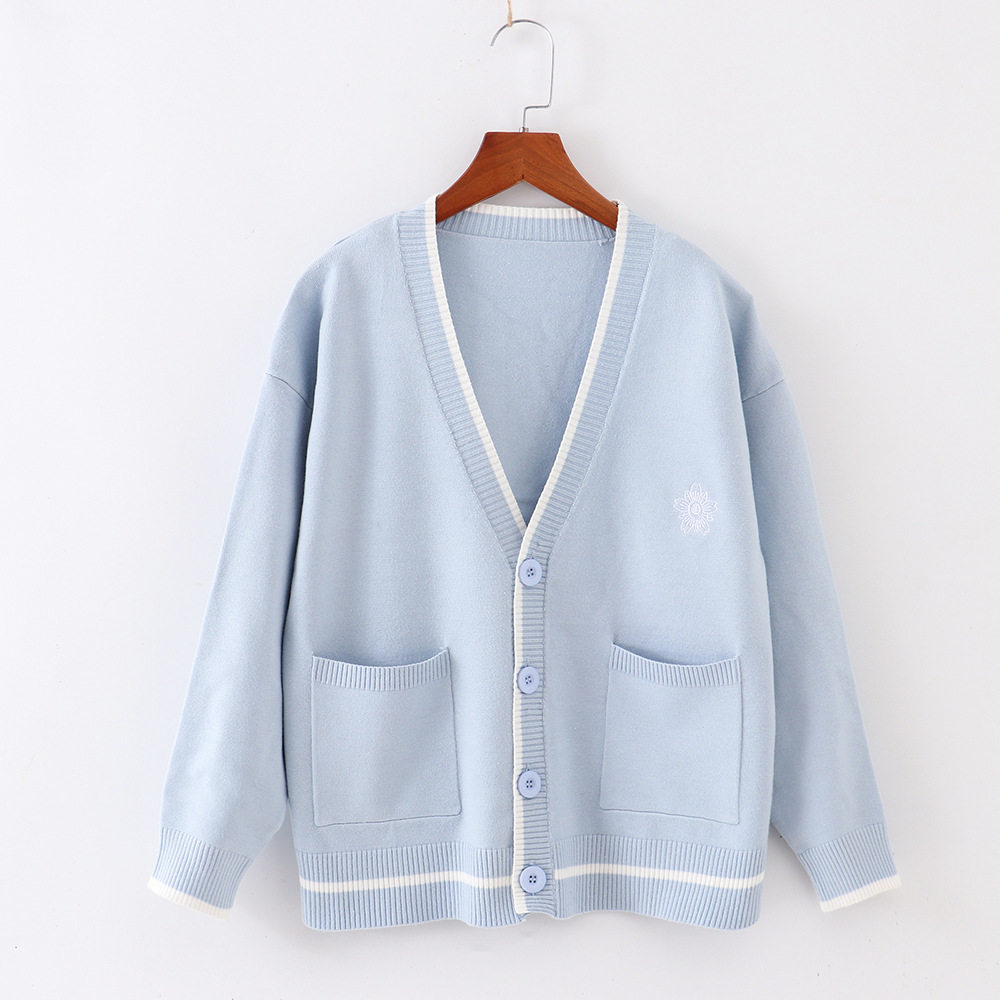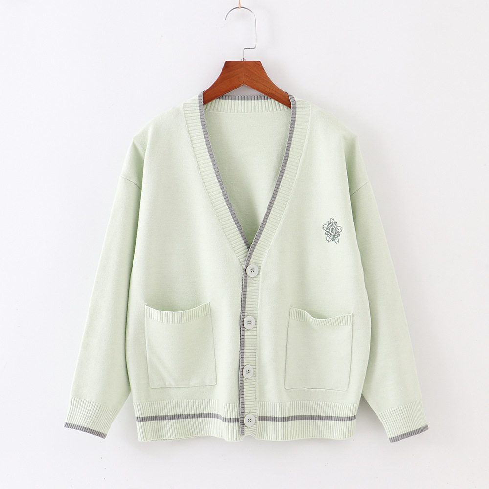 网红亲款绣花日系jk制服开衫毛衣宽松慵懒学生长袖开衫水色黄毛衣