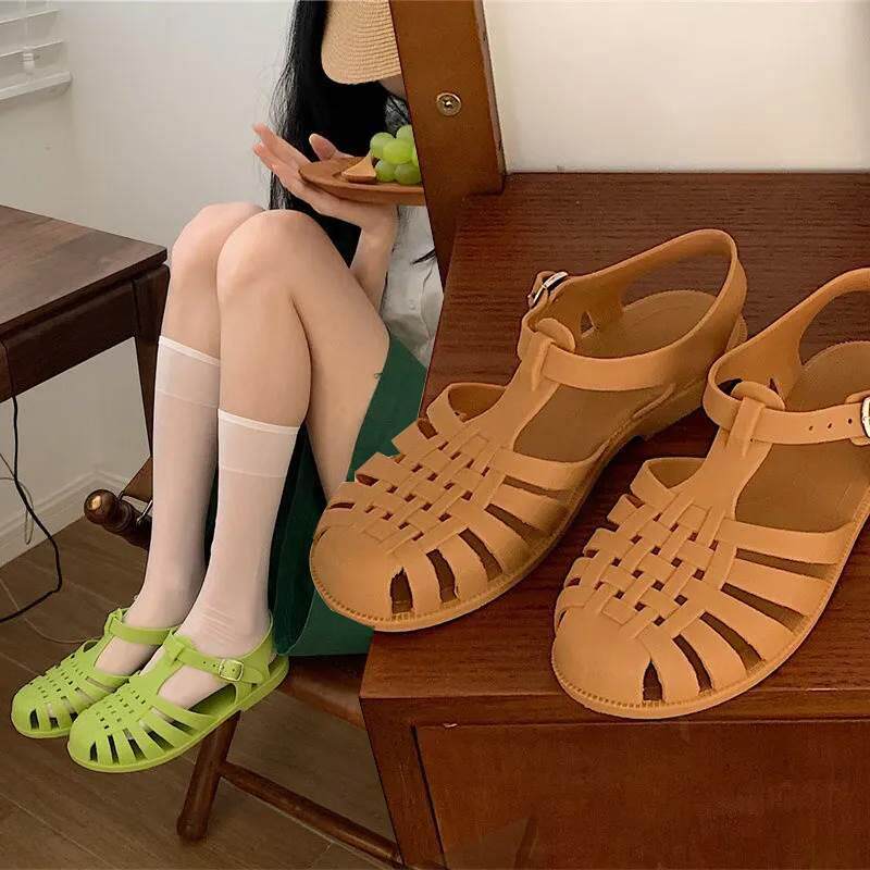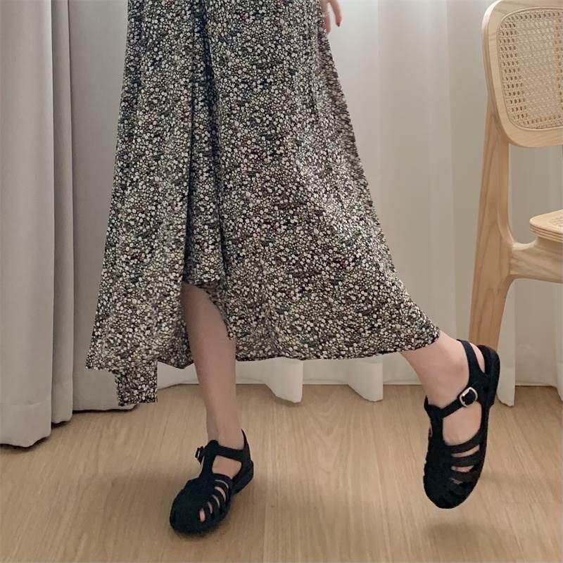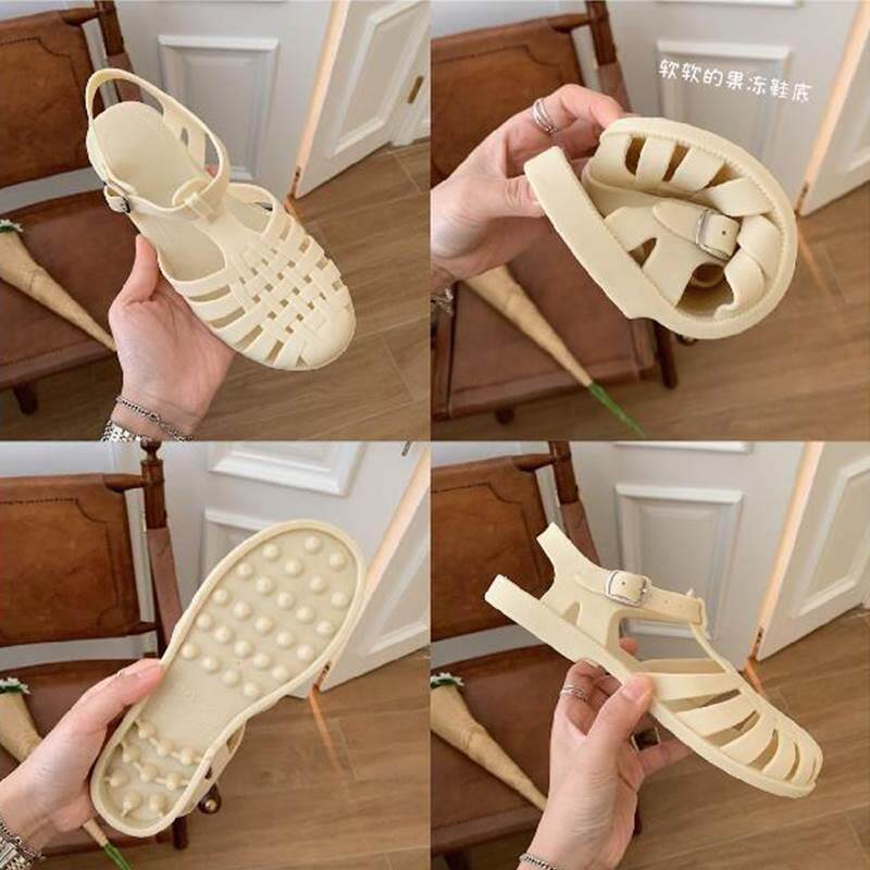 ins韩版复古编织镂空罗马平底果冻鞋女士包头沙滩鞋时尚防滑凉鞋