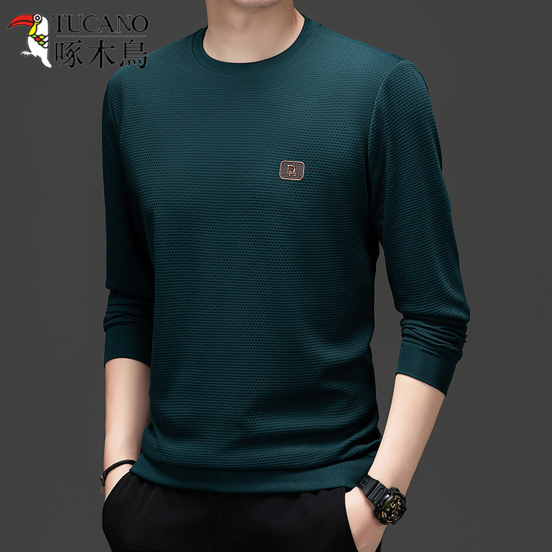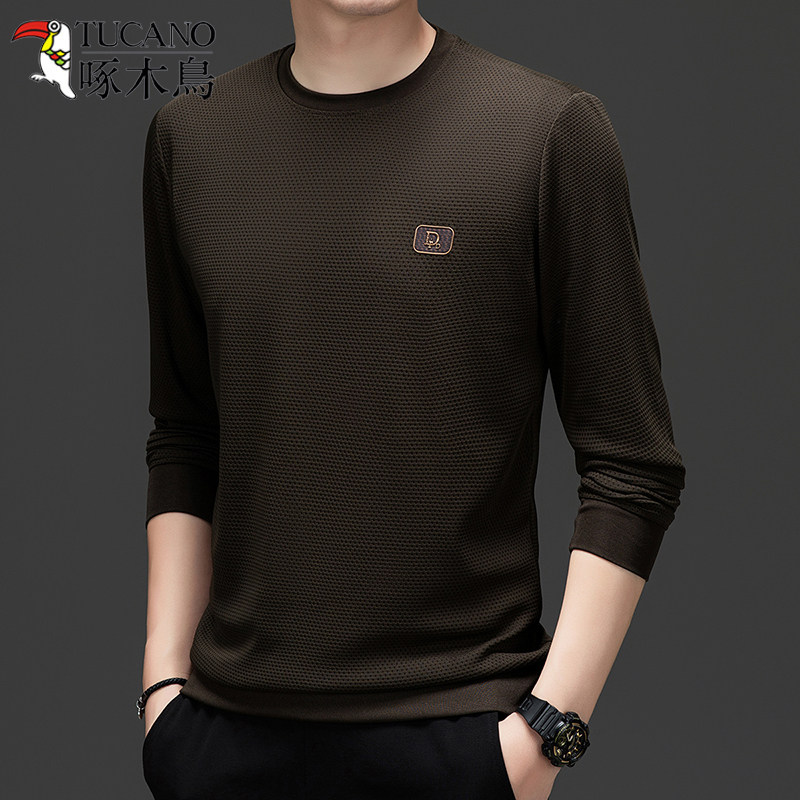 啄木鸟春秋季男士圆领卫衣2024年新款百搭长袖T恤套头针织打底衫