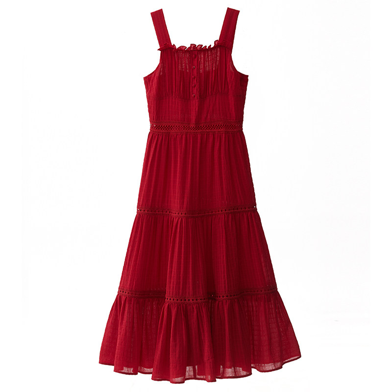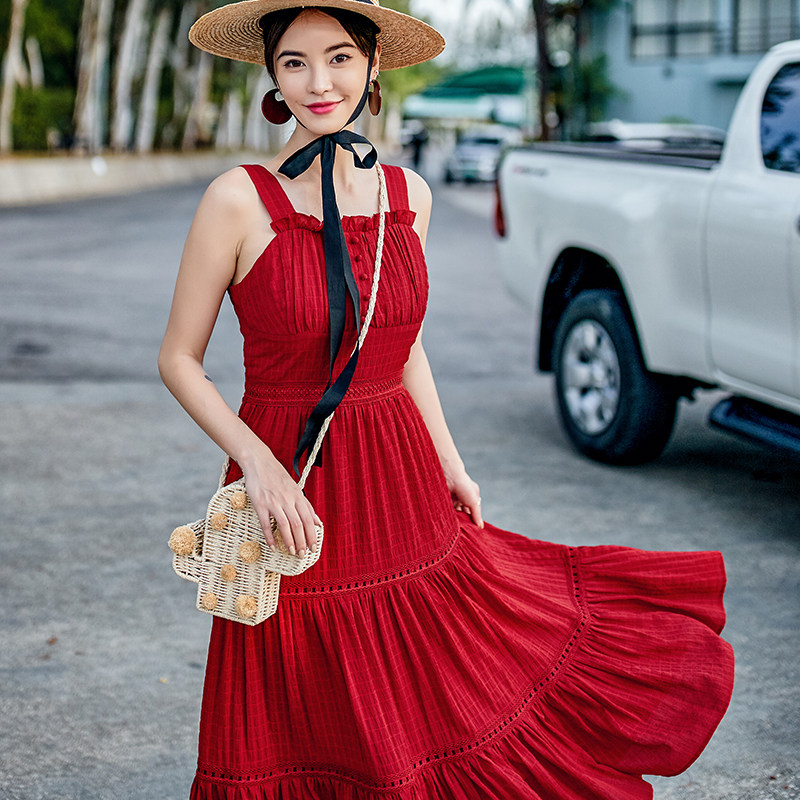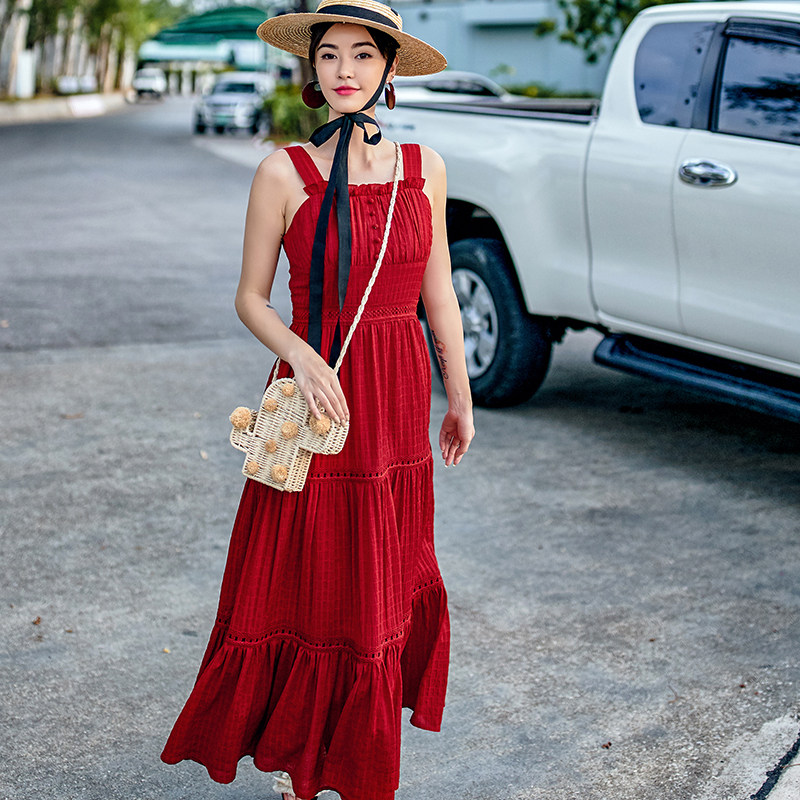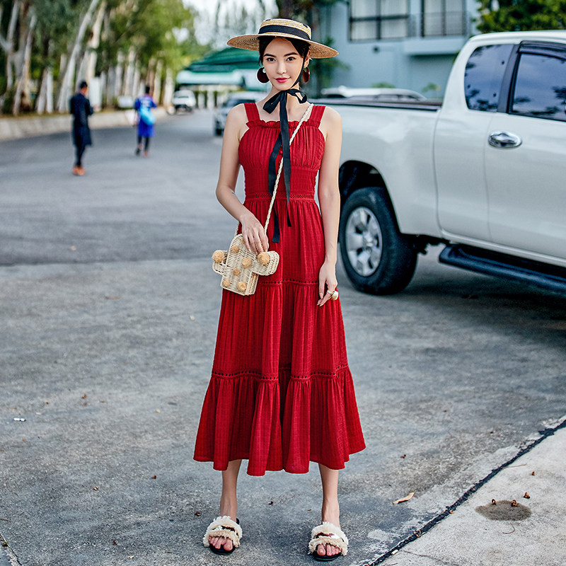 淘宝VIMI原创设计女装,vimi法式复古红色大摆吊带连衣裙女夏季性感露背泰国三亚海边度假