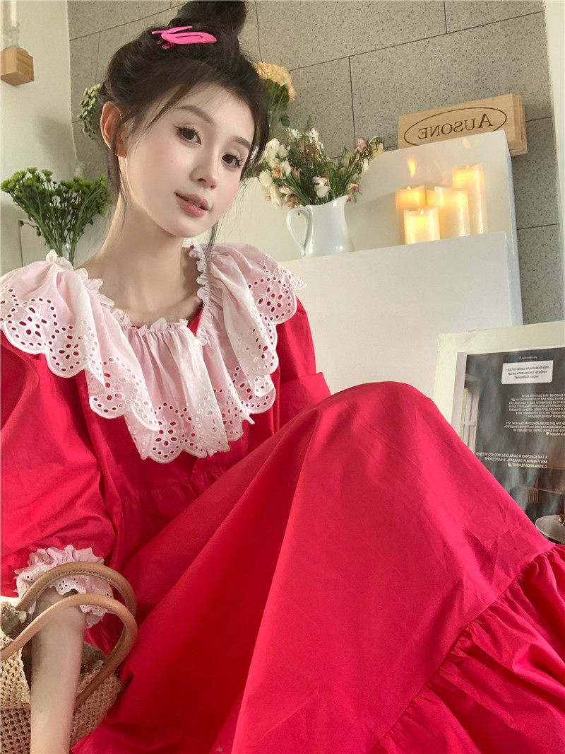 淘宝可淘学姐 大码女装,大码胖妹妹mm宽松夏季玫红色气质蕾丝拼接泡泡短袖连衣裙女裙子潮