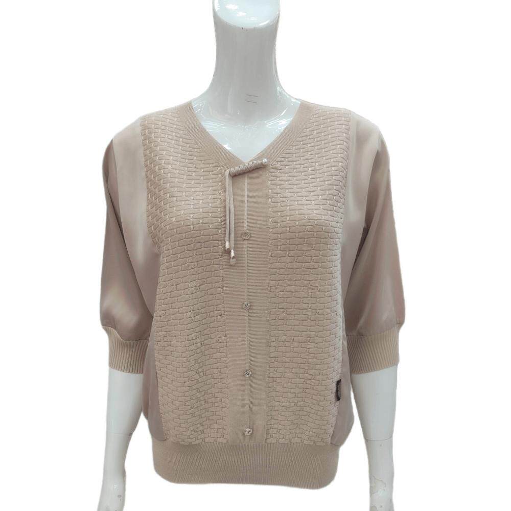 妈妈冰丝中袖T恤洋气V领雪纺针织拼接上衣2024秋季中老年大码女装