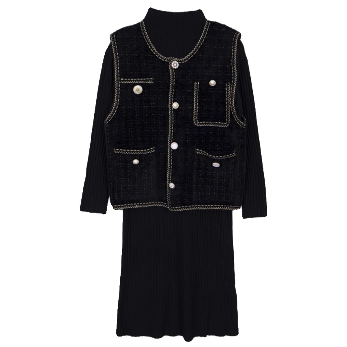 赫宁大码女装复古套装2024春季新款微胖mm内搭针织连衣裙两件套