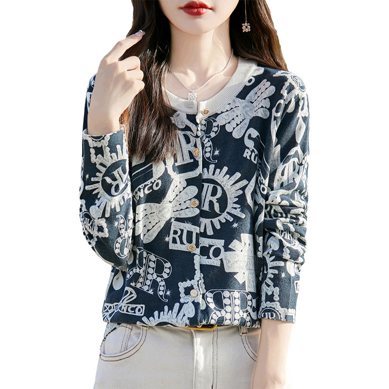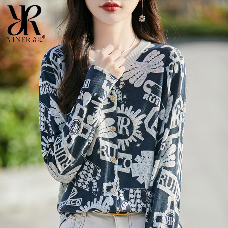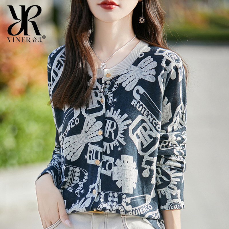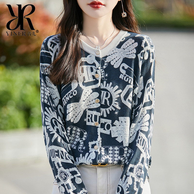淘宝YE折扣店,音儿圆领精仿羊毛开衫女2024春秋新款宽松印花撞色长袖针织外套