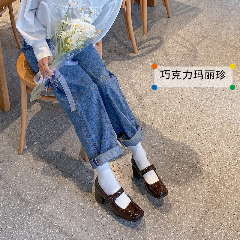 巧克力粗跟玛丽珍花未著复古*女鞋