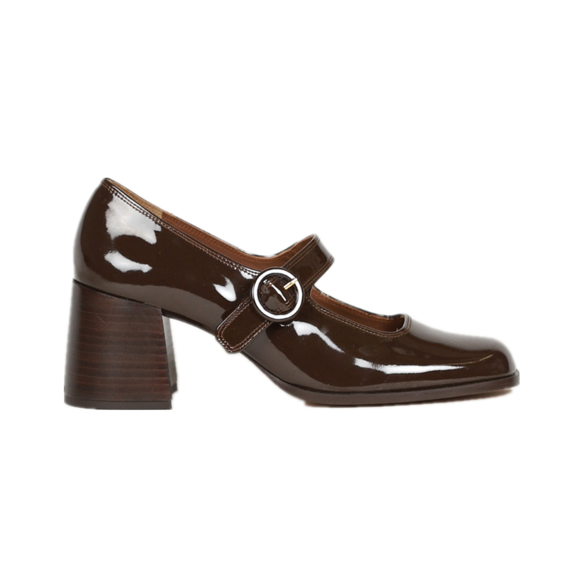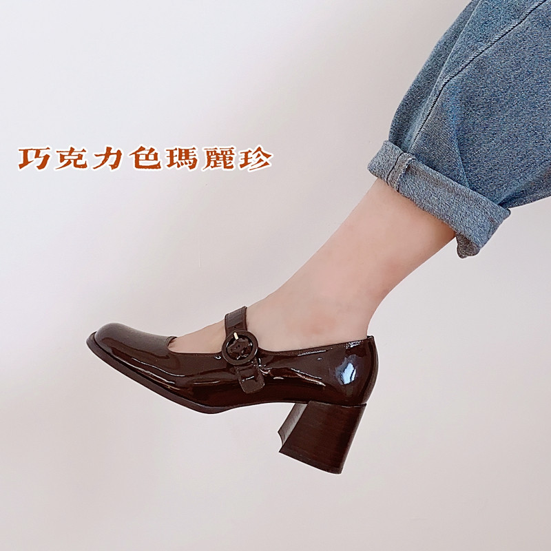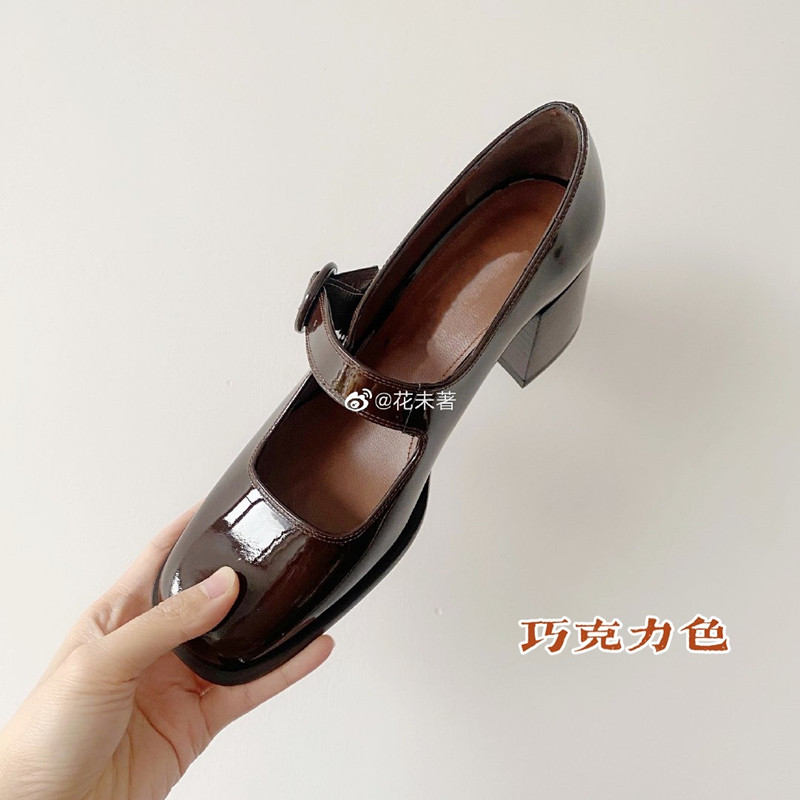 巧克力粗跟玛丽珍花未著复古法式方头car*el漆皮高跟真皮浅口女鞋