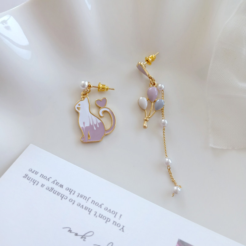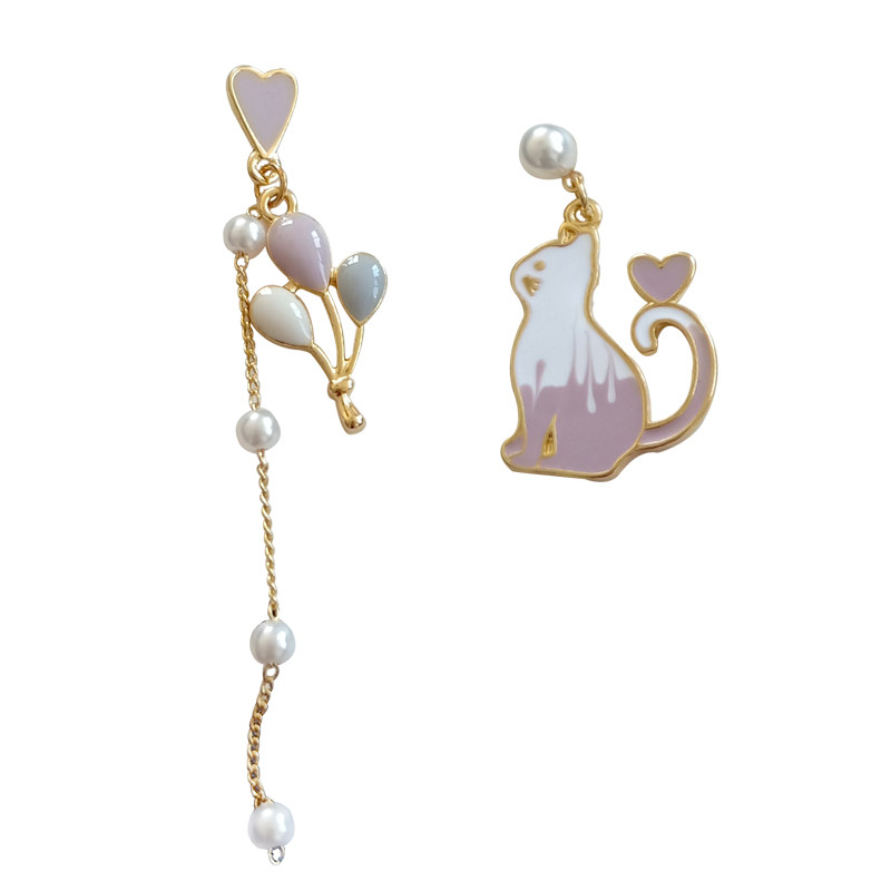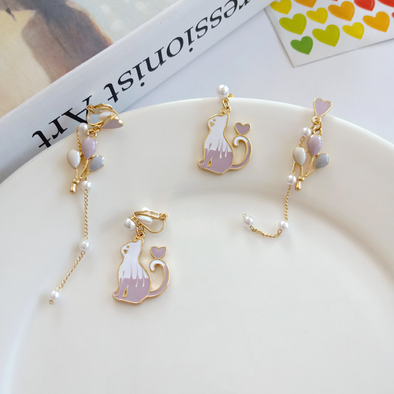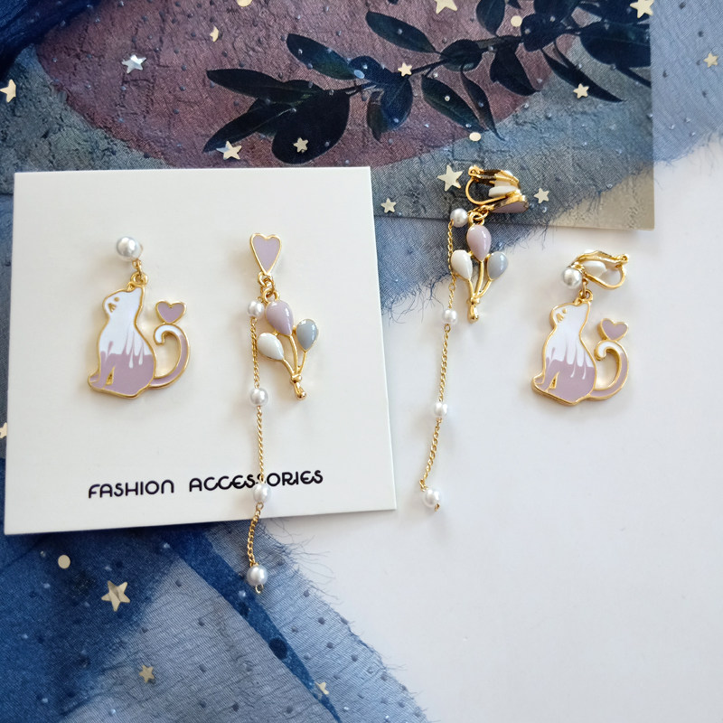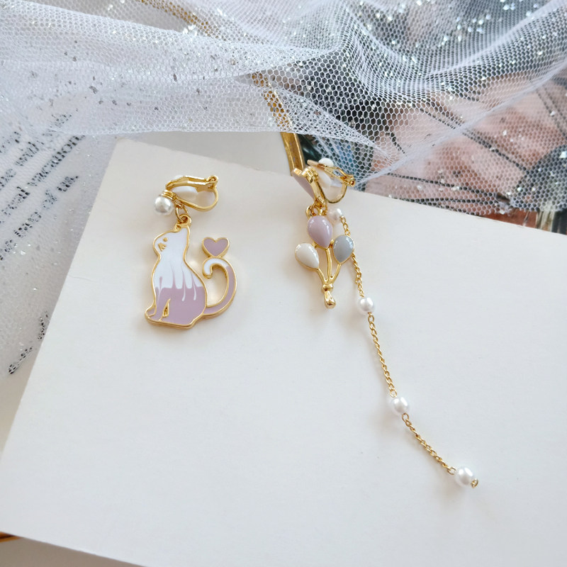 可爱小清新对称猫咪耳钉唯美少女气质彩色气球珍珠滴油耳夹耳环