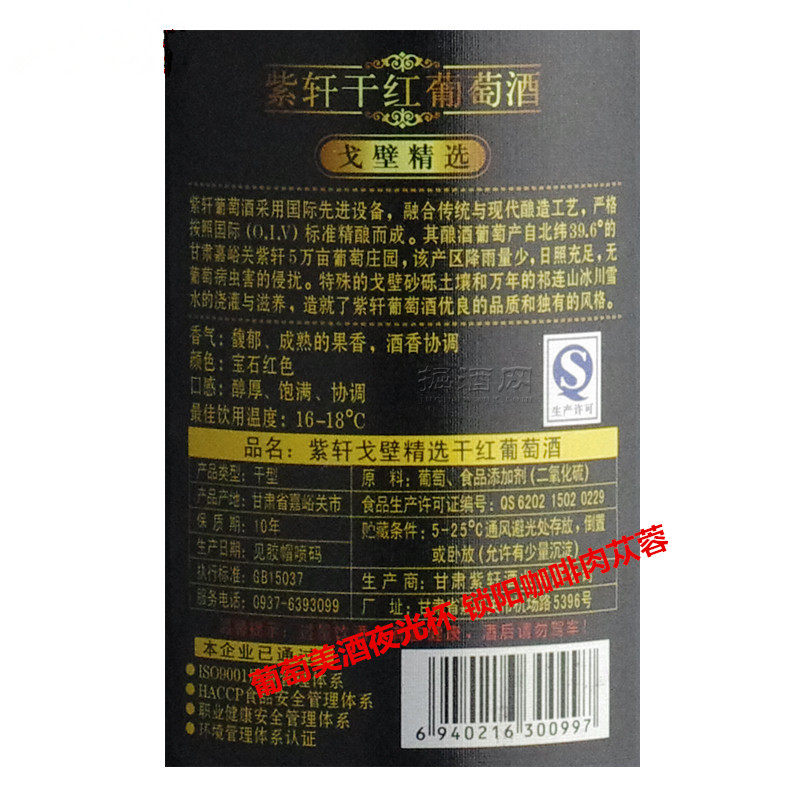 紫轩红酒--紫轩戈壁精选干红葡萄酒/过节礼品bi备/包邮