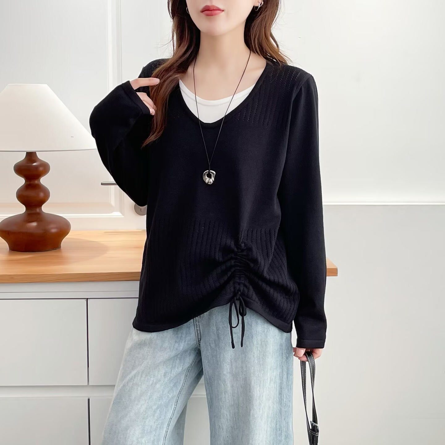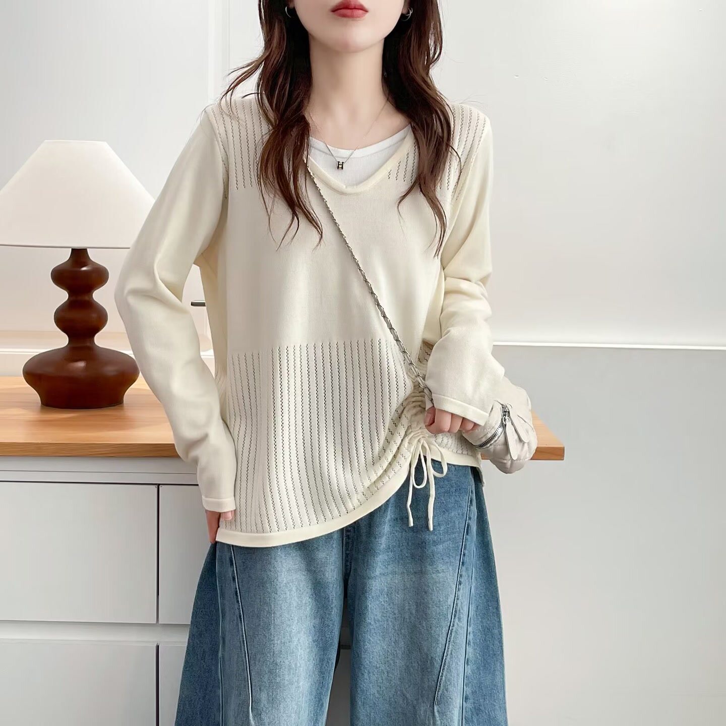 淘宝大女孩大码女装,大码胖mm百搭显瘦镂空假两件针织衫女春季新款减龄休闲上衣2573