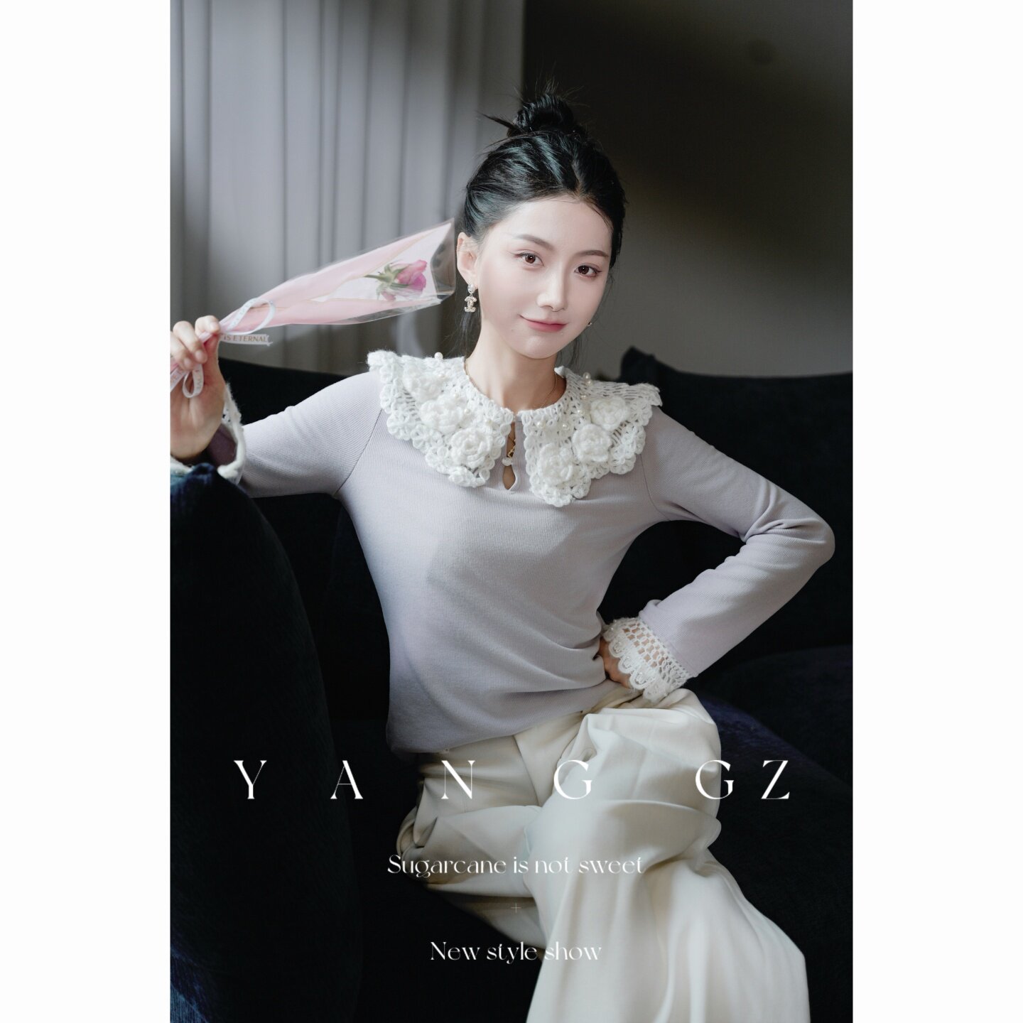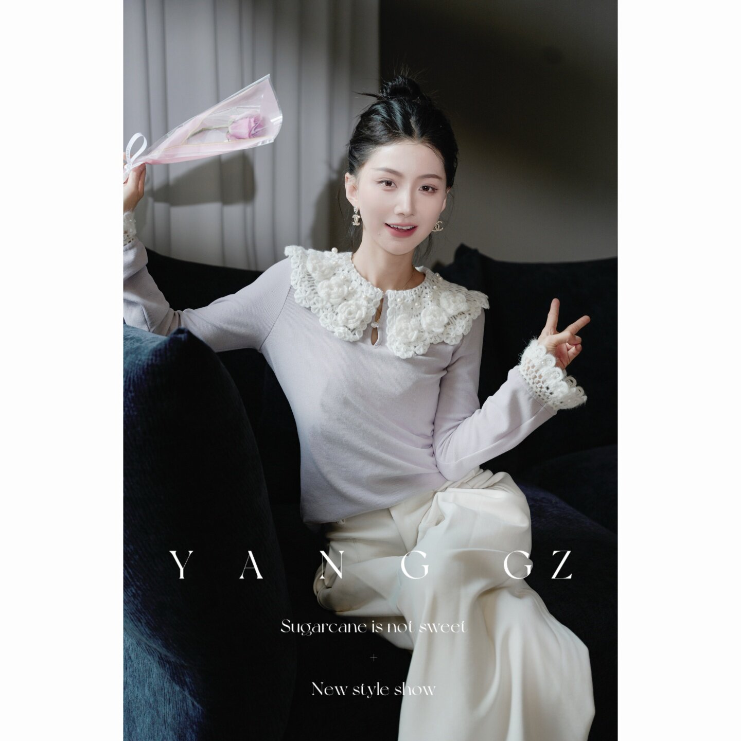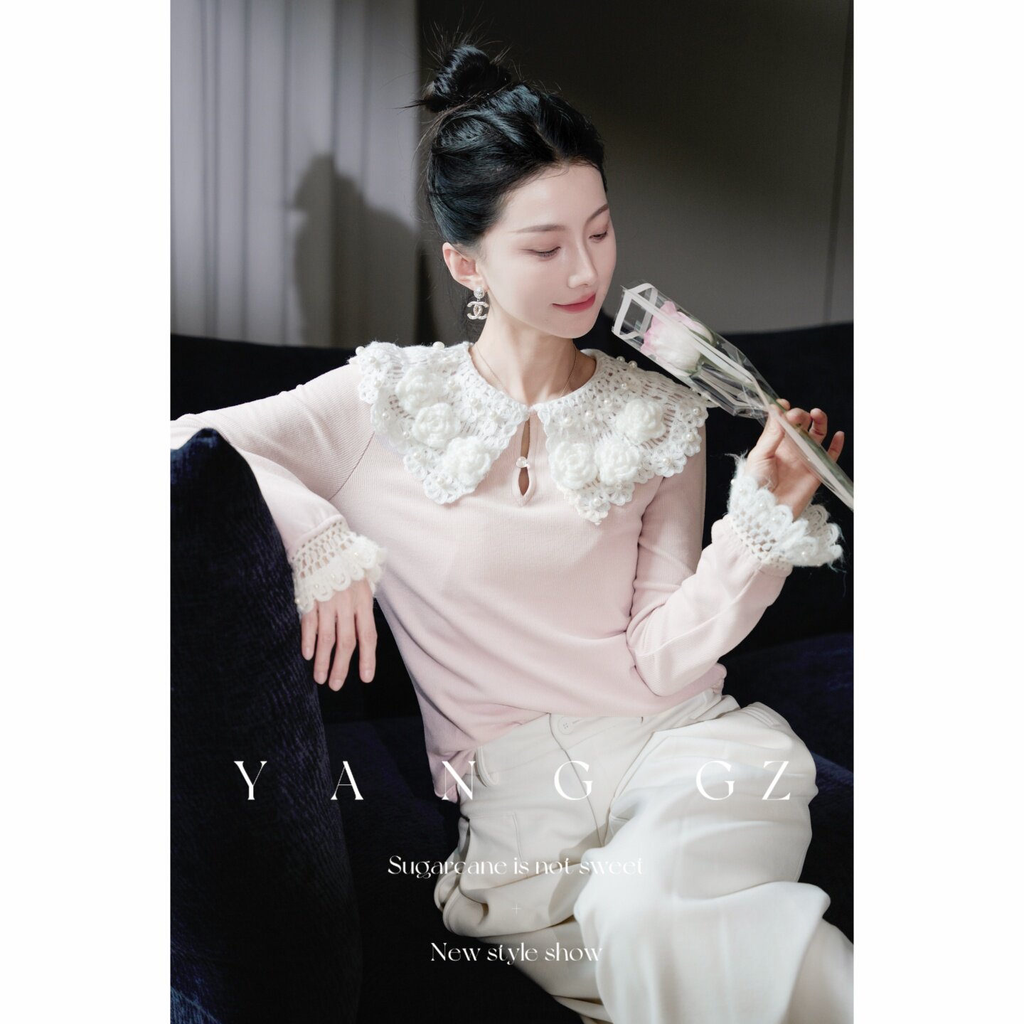 淘宝甘蔗 YANG GZ,新款秋冬季翻领钩花打底衫上衣女
