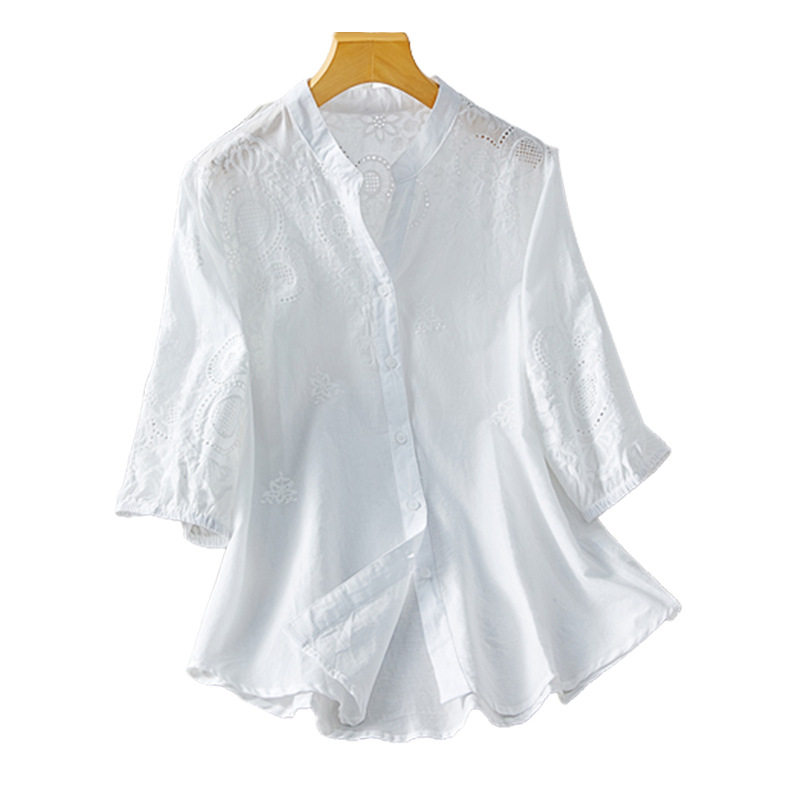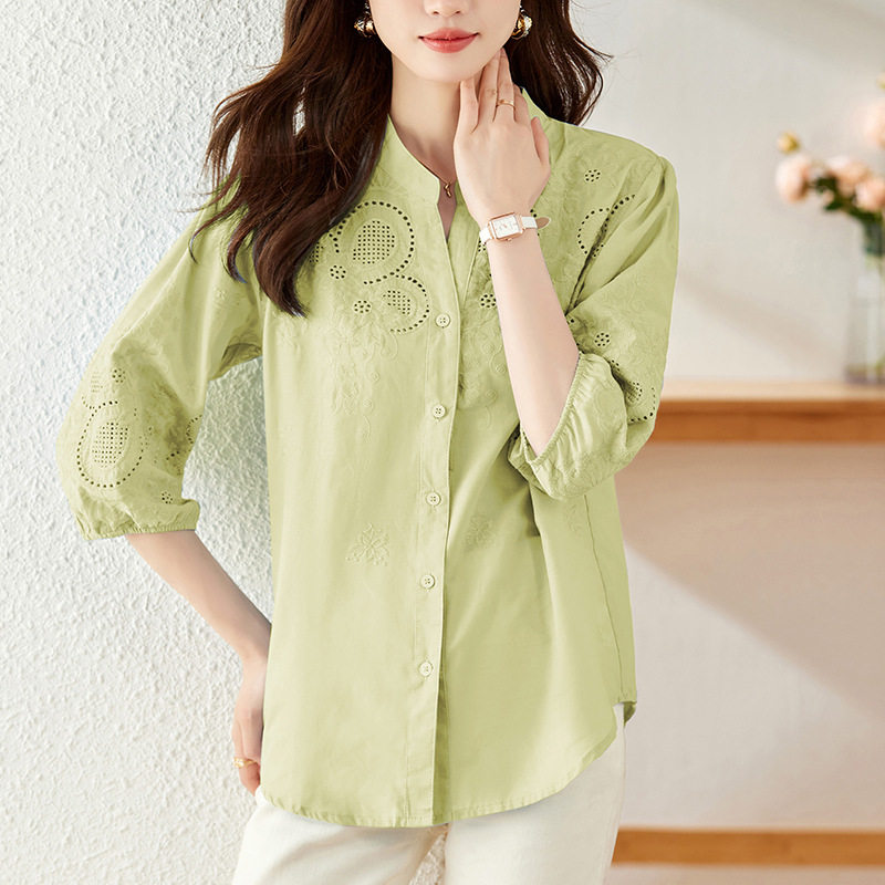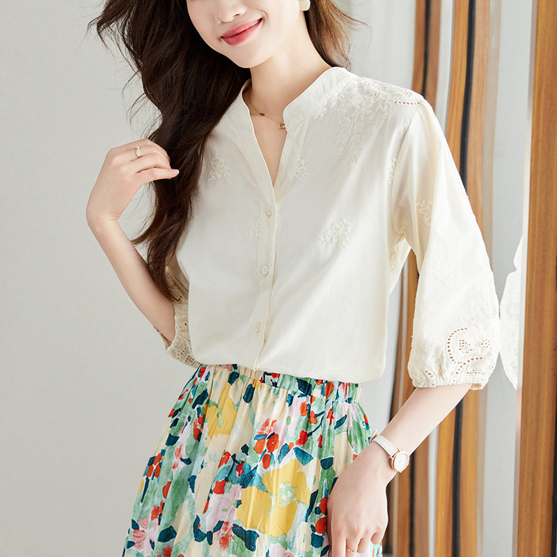 淘宝垣小衫的店,V领绣花镂空杏色衬衫女七分袖2026夏季新款通勤气质纯棉上衣