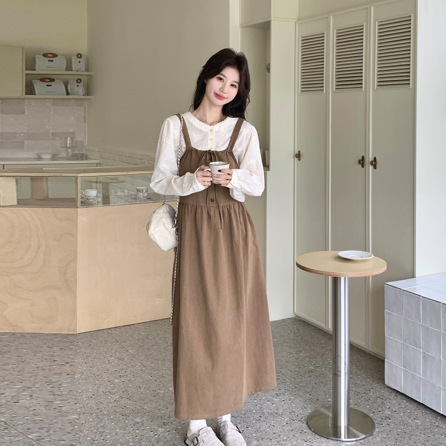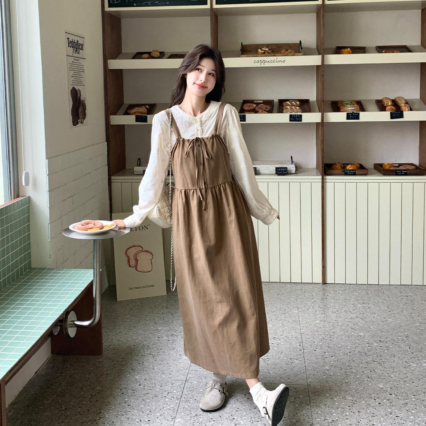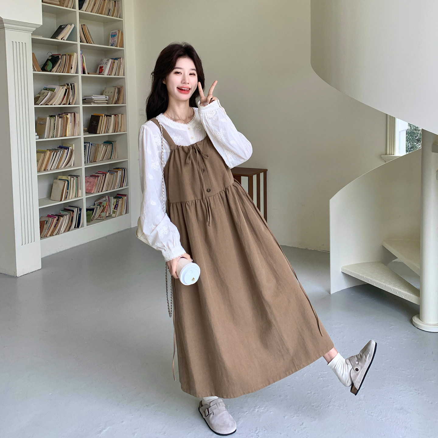 淘宝MOBAI 轻奢定制,咖色学院减龄风吊带连衣裙套装女2026春天新款蕾丝刺绣衬衫两件套