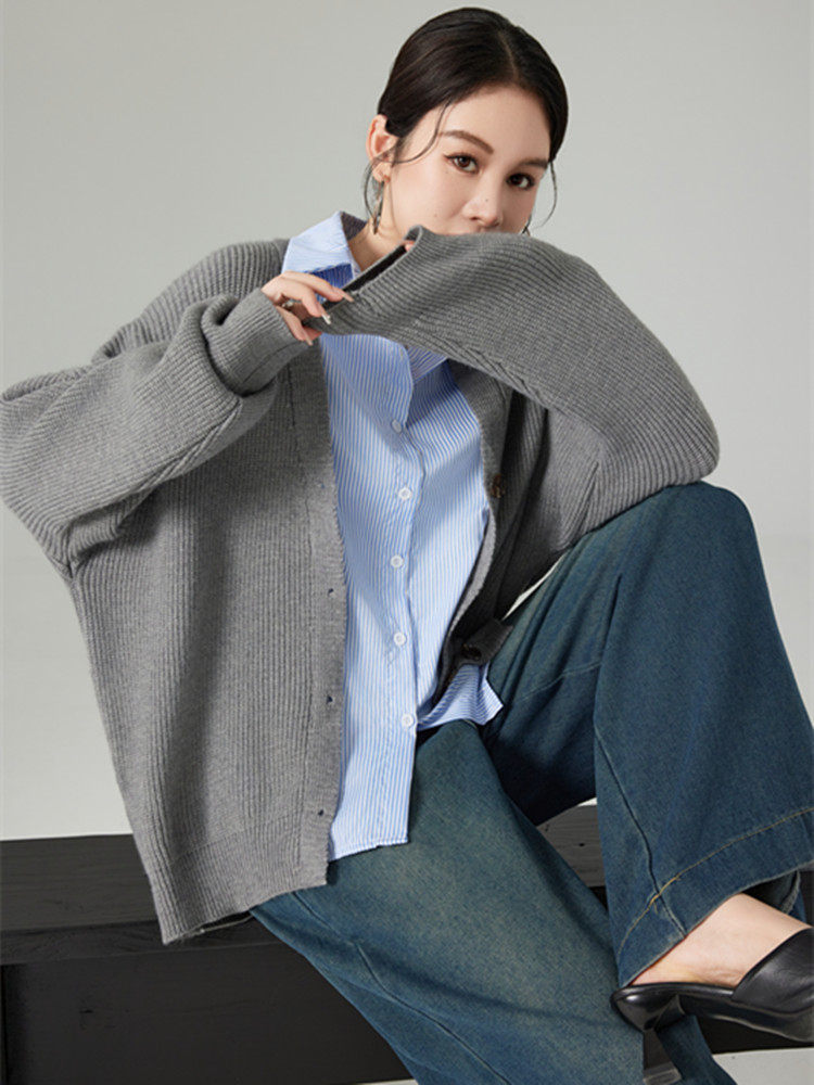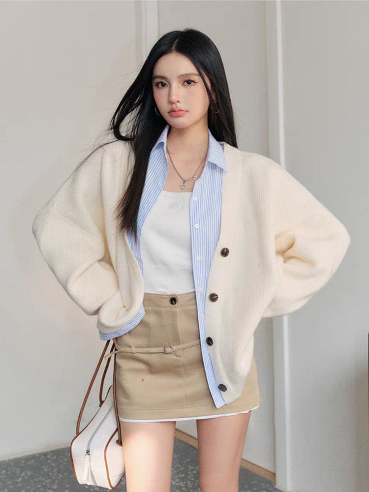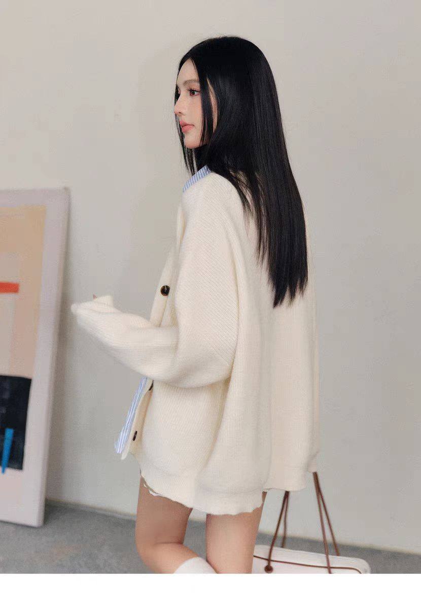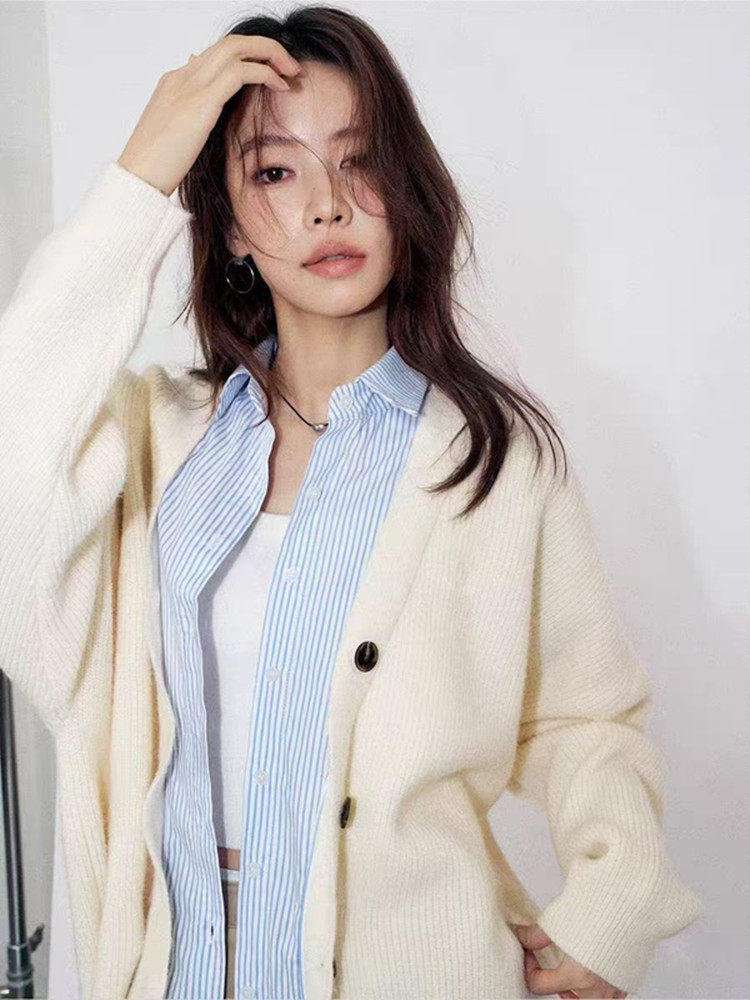 高级感条纹衬衫拼接针织开衫女2024年秋冬新款宽松毛衣外套假两件