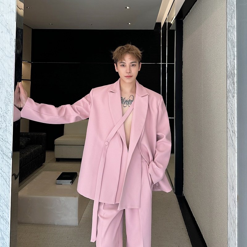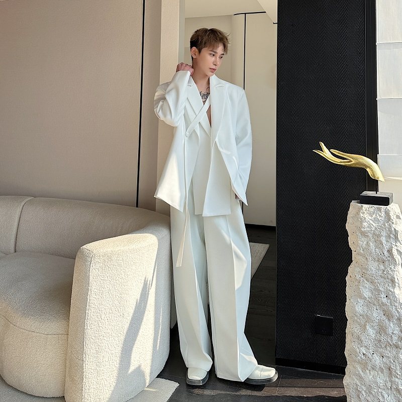 淘宝小柒家潮流男装,2025春季小众双领绑带西服套装男设计感阔腿西裤高级感网红两件套
