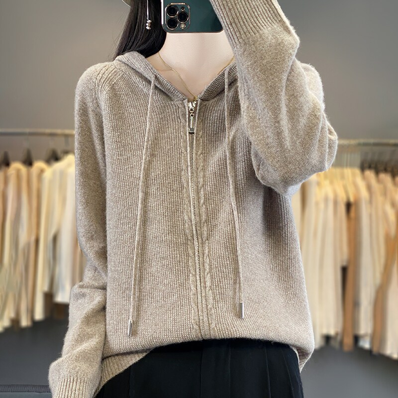 毛衣开衫女2024新款双拉链女士宽松春秋外穿连帽外套慵懒风针织衫
