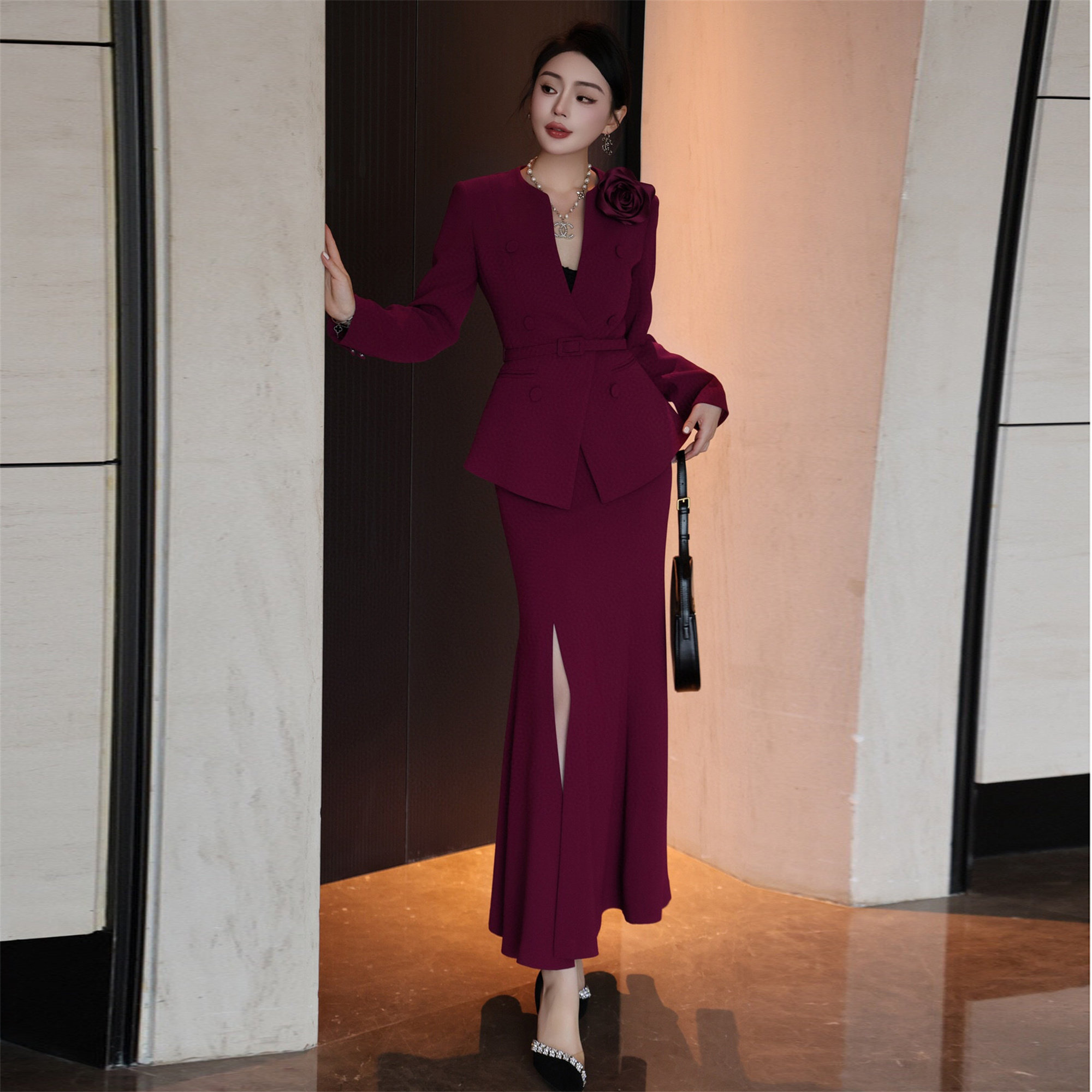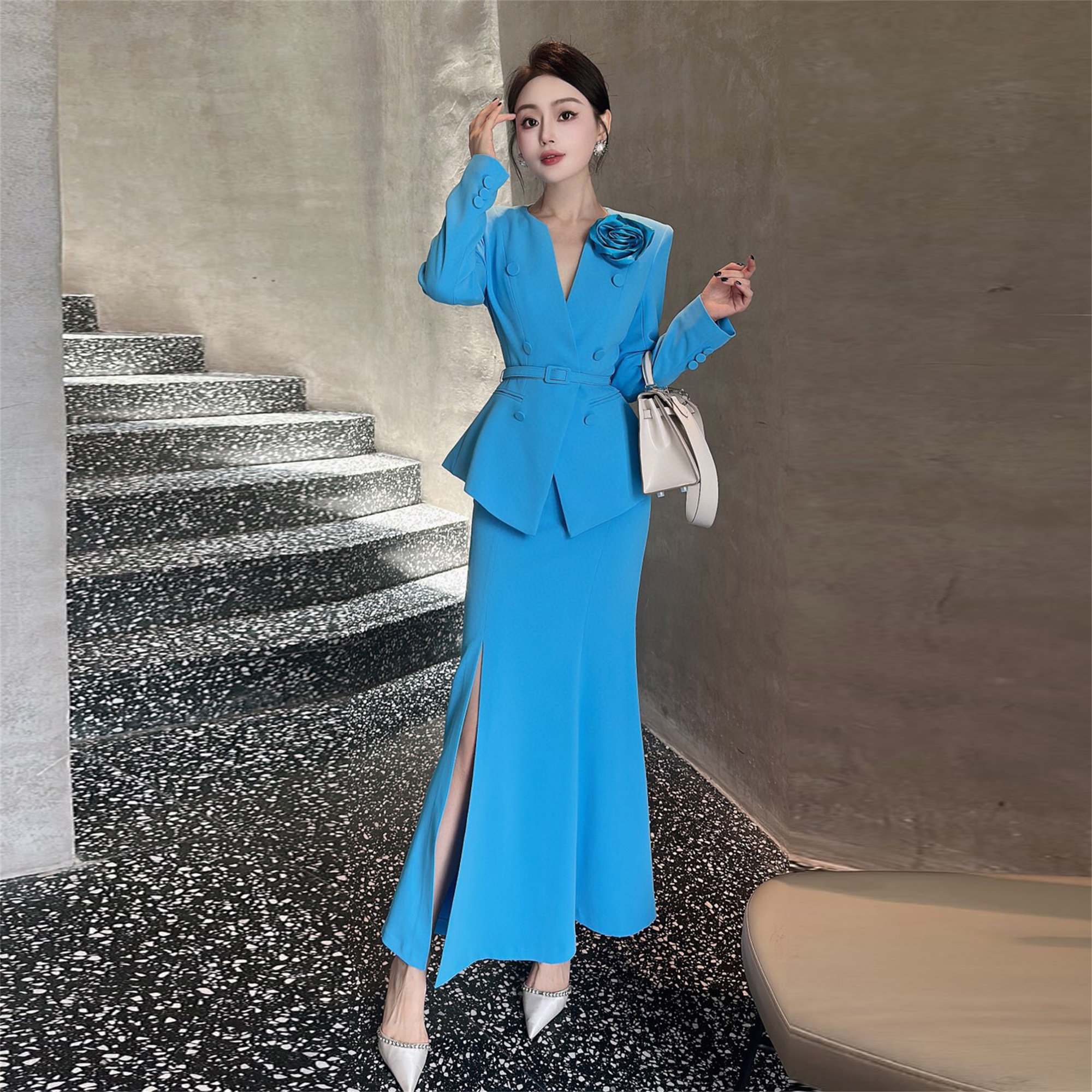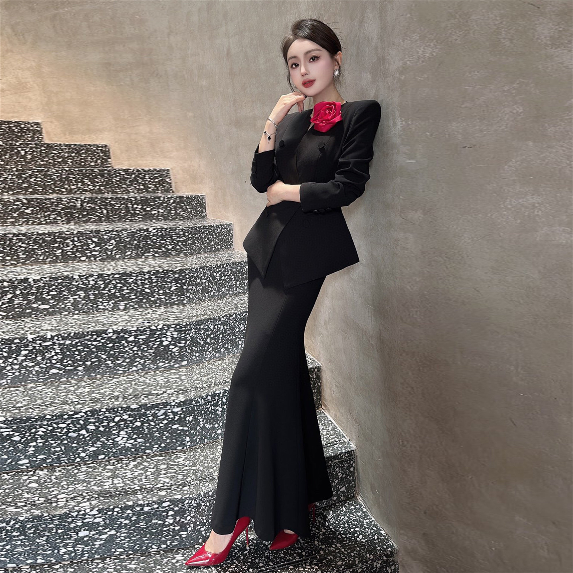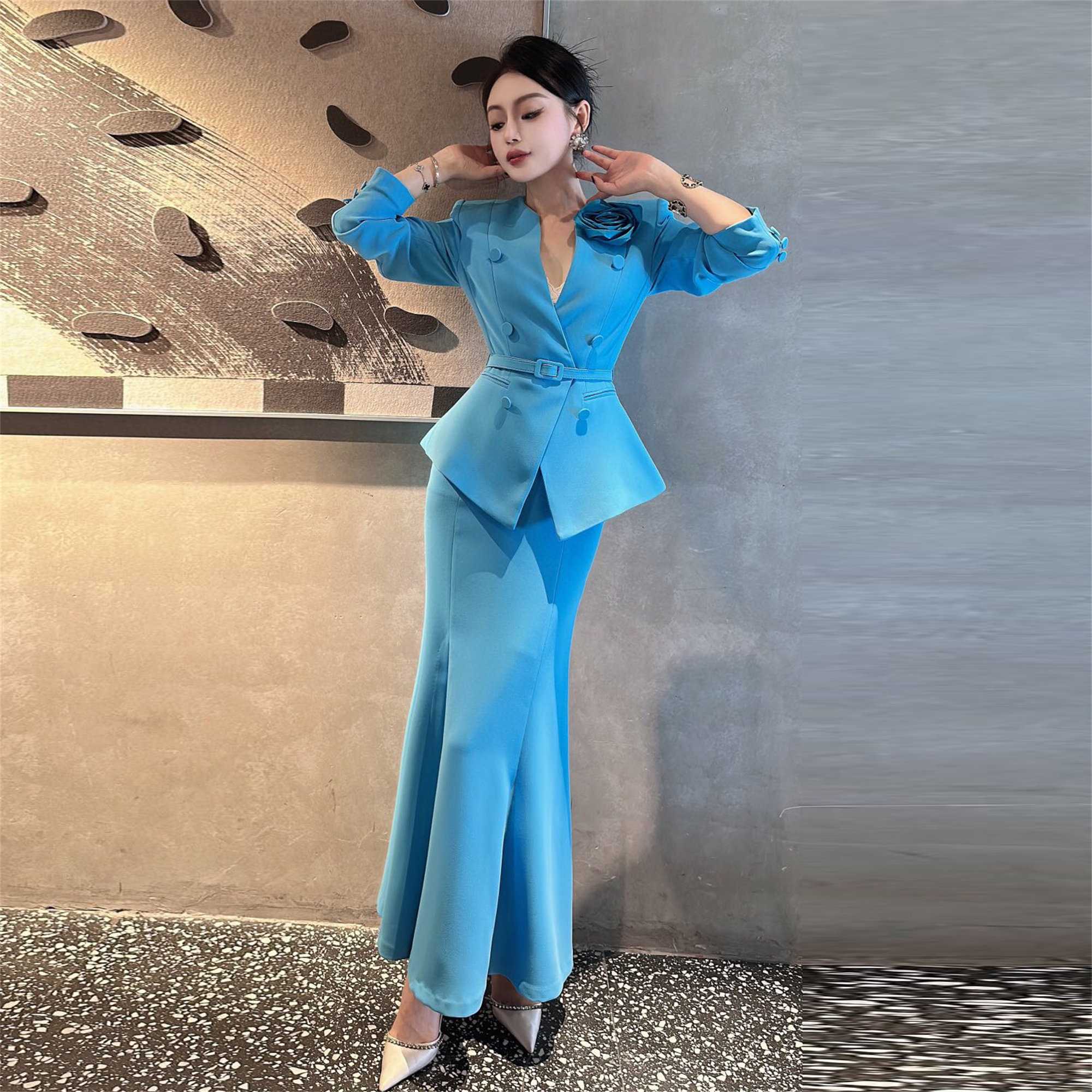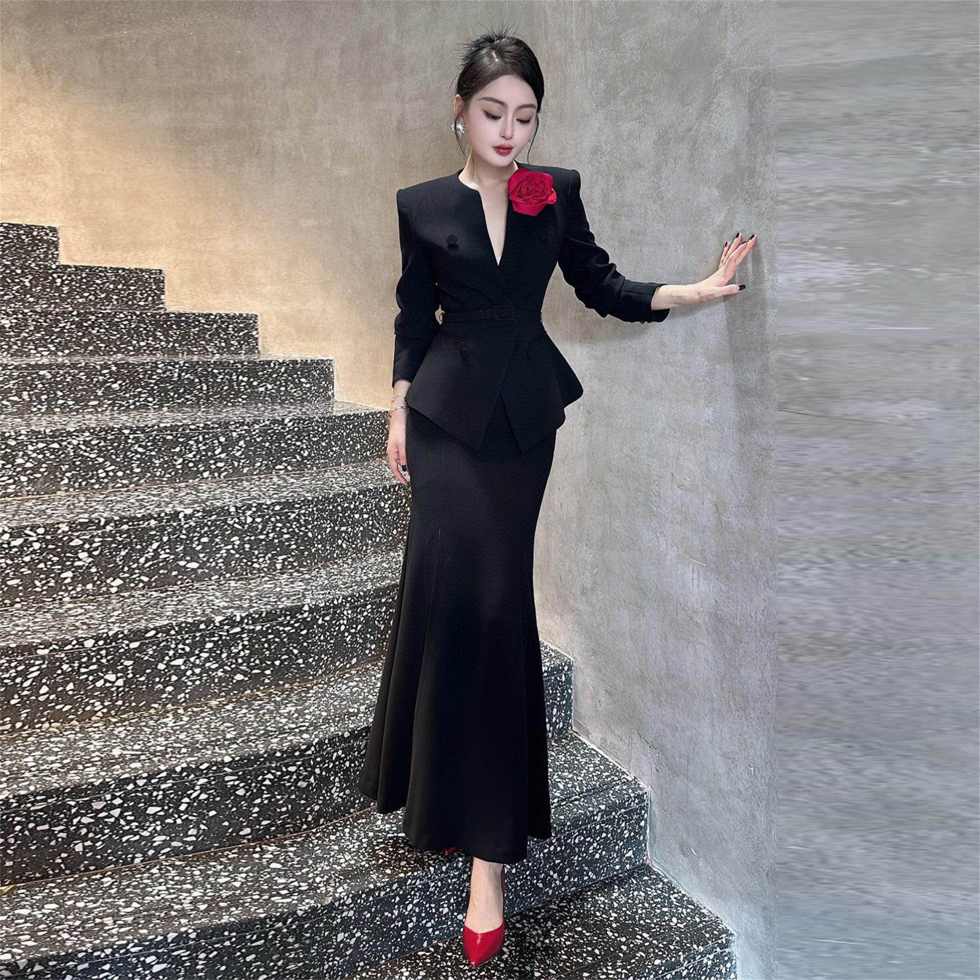 ZIZM气质名媛职业装2024秋季新款爆款收腰显瘦V领上衣鱼尾裙套装