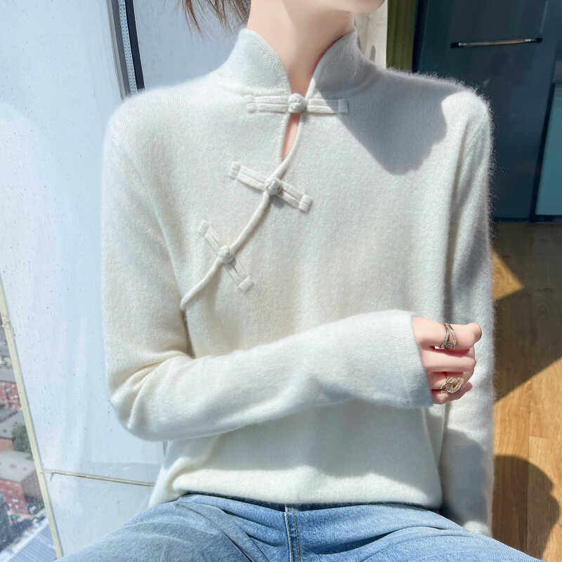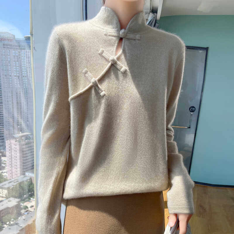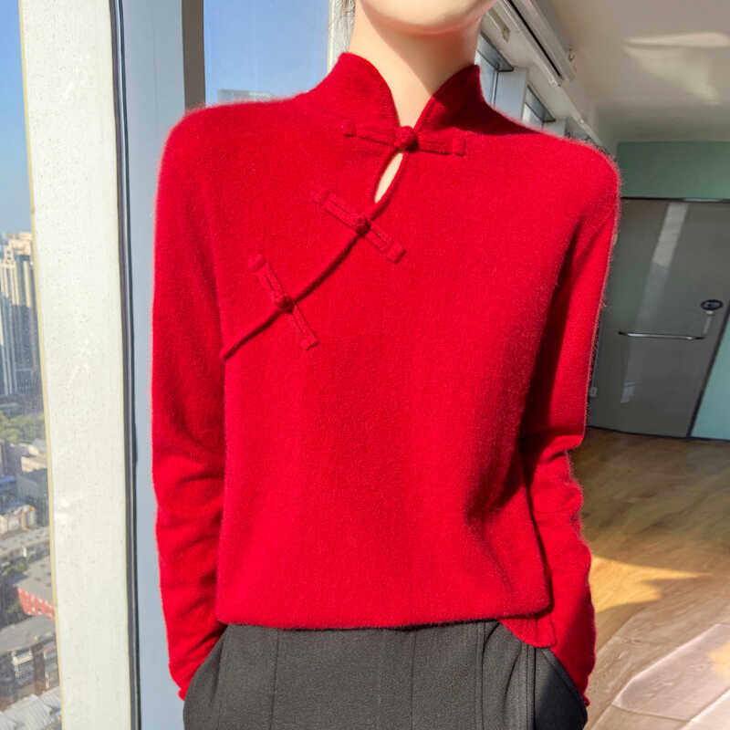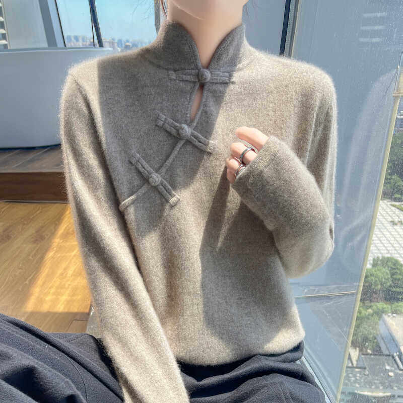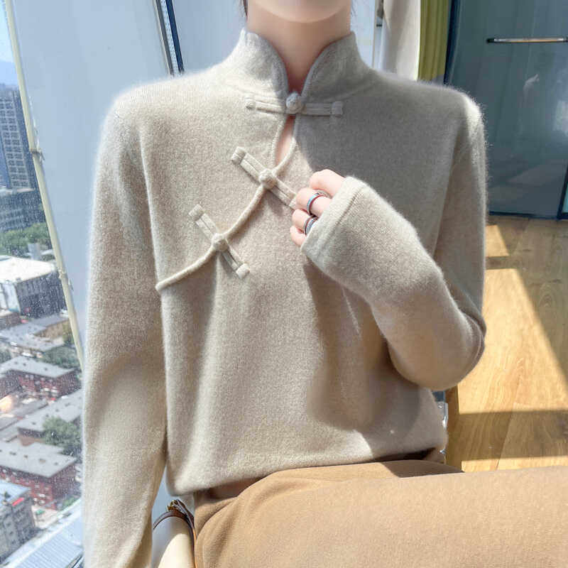 秋冬款复古立领100%纯羊绒衫女长袖盘扣毛衣羊毛中国风针织打底衫