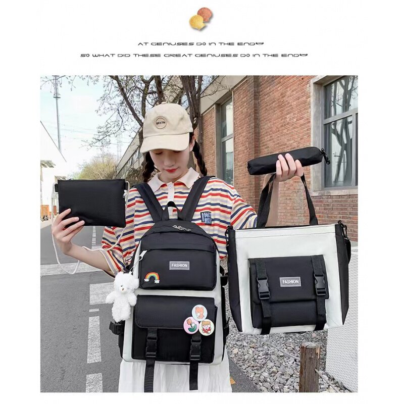 新款四件套中学生背包帆布双肩包女韩版原宿大容量书包学院风