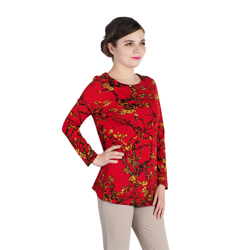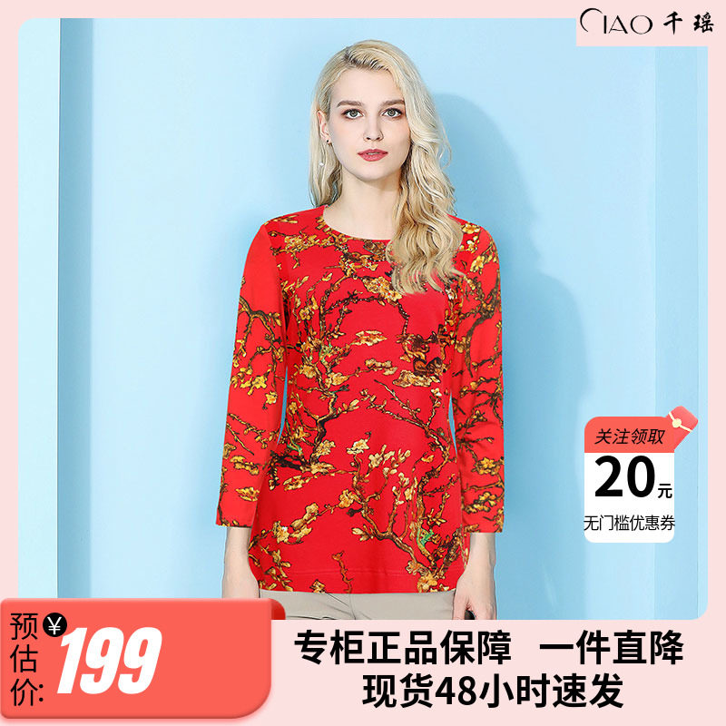 淘宝千瑶品牌企业店,优雅2021秋季复古红色印花圆领上衣