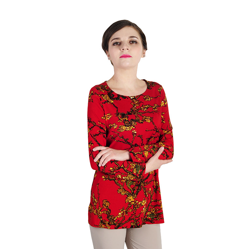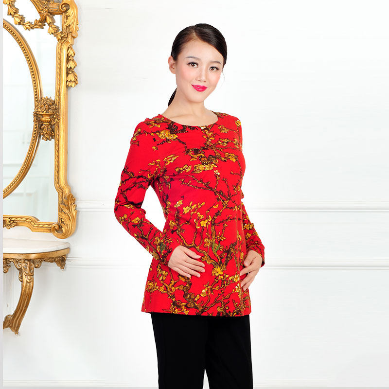 优雅秋季复古红色艺术印花圆领长袖中长款大码修身婆婆装上衣