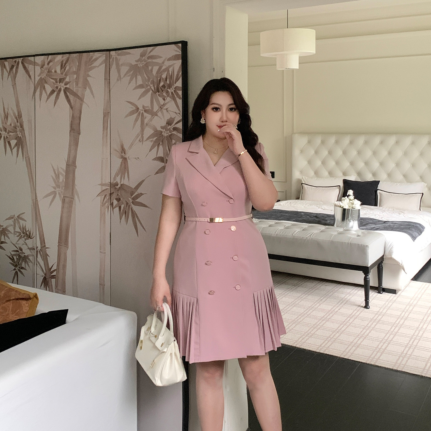 GLEC大码女装2024夏季新款法式名媛风设计感女神范西装百褶连衣裙