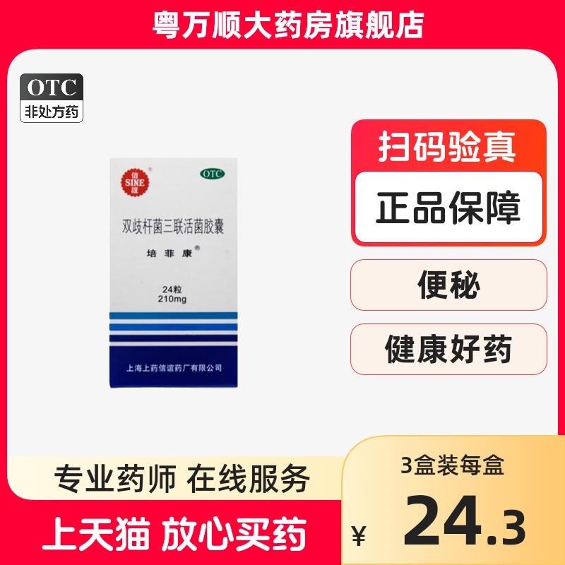 天猫粤万顺大药房旗舰店,【培菲康】双歧杆菌三联活菌胶囊210mg*24粒/瓶单品包邮,主治因肠道菌群失调引起的急慢性腹泻、便秘