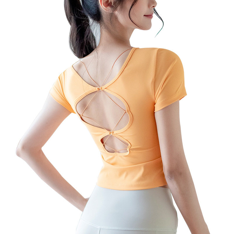 新款运动上衣女瑜伽服速干高弹美背镂空健身服跑步带胸垫圆领短袖